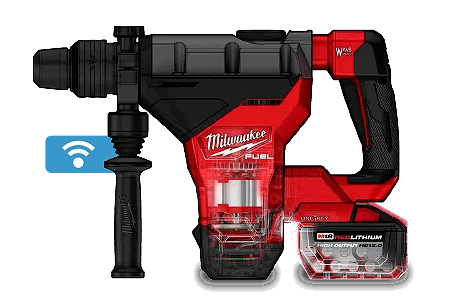 Our M18 FUEL™ 1-3/4” SDS Max Rotary Hammer w/ ONE KEY™ generates the power of a 15A Corded Rotary Hammer. It has a 1-3/4" capacity, 8.1 ft-lbs of impact energy, 380 RPM, and 2,900 BPM. Our cordless rotary hammer is designed for the professional user, allowing ultimate power, control, enhanced safety, and productivity. The POWERSTATE™ Brushless Motor gives you 8.1 ft-lbs of impact energy that meets and rivals that of corded competition. REDLINK PLUS™ intelligence tool technology ensures maximum rotary drill performance and protects it from overload, overheating, and over discharge. Our M18 REDLITHIUM™ High Output HD12.0 battery delivers unmatched run-time in all applications when used with the rotary hammer drill. It allows the SDS Max hammer drill to chip 1/2 ton of material per charge so you can work harder for longer. Our full feature hammer delivers maximum control and enhanced safety with the AUTOSTOP™ E-Clutch. This prevents over-rotation in case the tool gets bound up while you are drilling in rebar or hard aggregate. Competitive tools can rotate up to 360 degrees while our rotary hammer will stop rotating at 45 degrees when the tool gets bound up. This feature is designed to give you more control while on the job. The cordless rotary hammer is compatible with ONE KEY™, wirelessly connecting to your smartphone to track and manage the tool’s performance and location. ONE-KEY™ integrated tool tracking gives you full visibility over how and where your tools are being used across your network of jobs and users. The technology is built into the tool and not the battery, allowing you to track it even if the battery is not charged or connected. The app will track all compatible devices within a 100 ft range of your phone, allowing you to pinpoint missing tools quicker and increase accountability of your crew. Integrated Tool Security provides the ultimate theft protection with features like tool lock-out, or the ability to hide power tools from nearby device screens allow you to protect your investments. If your tool is lost or stolen, you can render it inoperable by sending a remote command to the tool to shut itself off the next time it comes within range of any ONE-KEY™ app.