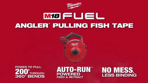 Our M18 FUEL™ ANGLER™ Interchangeable Pulling Fish Tape System is the world's first battery powered fish tape solution. The fish tape wire puller’s AUTO-RUN™ Powered Feed and Retract eliminates manual pulling tools for less user fatigue and automatically reels the tape back into the Replacement Cartridge for a cleaner jobsite. Our electric fish tape wire puller features a POWERSTATE™ Brushless Motor that provides the ability to pull wire through a 200' run with 360° degrees of bends. This new battery powered fish tape puller is more efficient with an automatic feed that pushes through bends faster for maximum jobsite efficiency. The MILWAUKEE® M18 FUEL™ ANGLER™ Pulling Fish Tape Powered Base is powered by the M18™ REDLITHIUM™ battery pack (not included) and is compatible with 3 Less Binding steel and non-conductive Replacement Cartridges to tackle any situation. Our automatic wire puller is equipped with REDLINK PLUS™ Intelligence to ensure maximum performance and protection from overload.