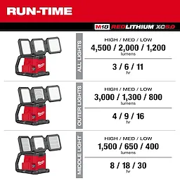 Our M18™ ROVER™ Dual Power Triple-Panel Flood & Area Light delivers a high-performing 4,500L OF FLOOD AND AREA LIGHTING and the most COMPACT PORTABILITY in its class. The light has three folding panels that provide optimal lighting coverage, offering various brightness modes and individual light head power options for any jobsite need. With a versatile base featuring a hook, magnet, and keyholes, you can effortlessly mount this light overhead in any jobsite environment. The M18™ ROVER™ Dual Power Triple-Panel Flood & Area Light delivers 4,500 lumens of TRUEVIEW™ High-Definition Output for 3 hours of runtime on high mode with an M18™ XC5.0 battery pack. On its lowest brightness setting, the light provides up to 30 hours of runtime with an M18™ XC5.0 battery pack. It also is equipped with an AC port for all-day runtime capability. Designed with the jobsite in mind, this light is IP54 rated, can withstand up to a 9 ft. drop, and is backed with a 5 Year Tool and a limited lifetime LED Warranty. MILWAUKEE® ROVER™ Flood Lights are built to go anywhere and withstand anything.