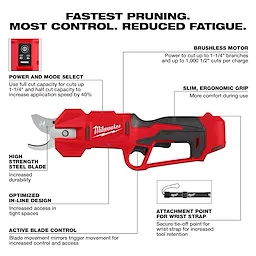Our M12™ Brushless Pruning Shears deliver the fastest, most controlled pruning while reducing fatigue. These pruning shears deliver the power to cut up to 1-1/4” branches while providing the ability to lock the blades into half of that capacity through the mode select board, increasing application speed by 40%. The M12™ Brushless Pruning Shears reduce muscle effort by 75% compared to manual solutions allowing users to complete tough applications with ease and speed. Our Active Blade Control enables the blade movement to follow the trigger movement, providing more control over the cut capacity during application. This, combined with the mode select and lightweight, inline design, offers better accessibility and control in intricate pruning applications. When paired with the M12™ CP2.0 Battery, these pruning shears deliver up to 1,000 cuts per charge in ½” branches. Our M12™ Brushless Pruning Shears are fully compatible with 150+ solutions within the M12™ system.