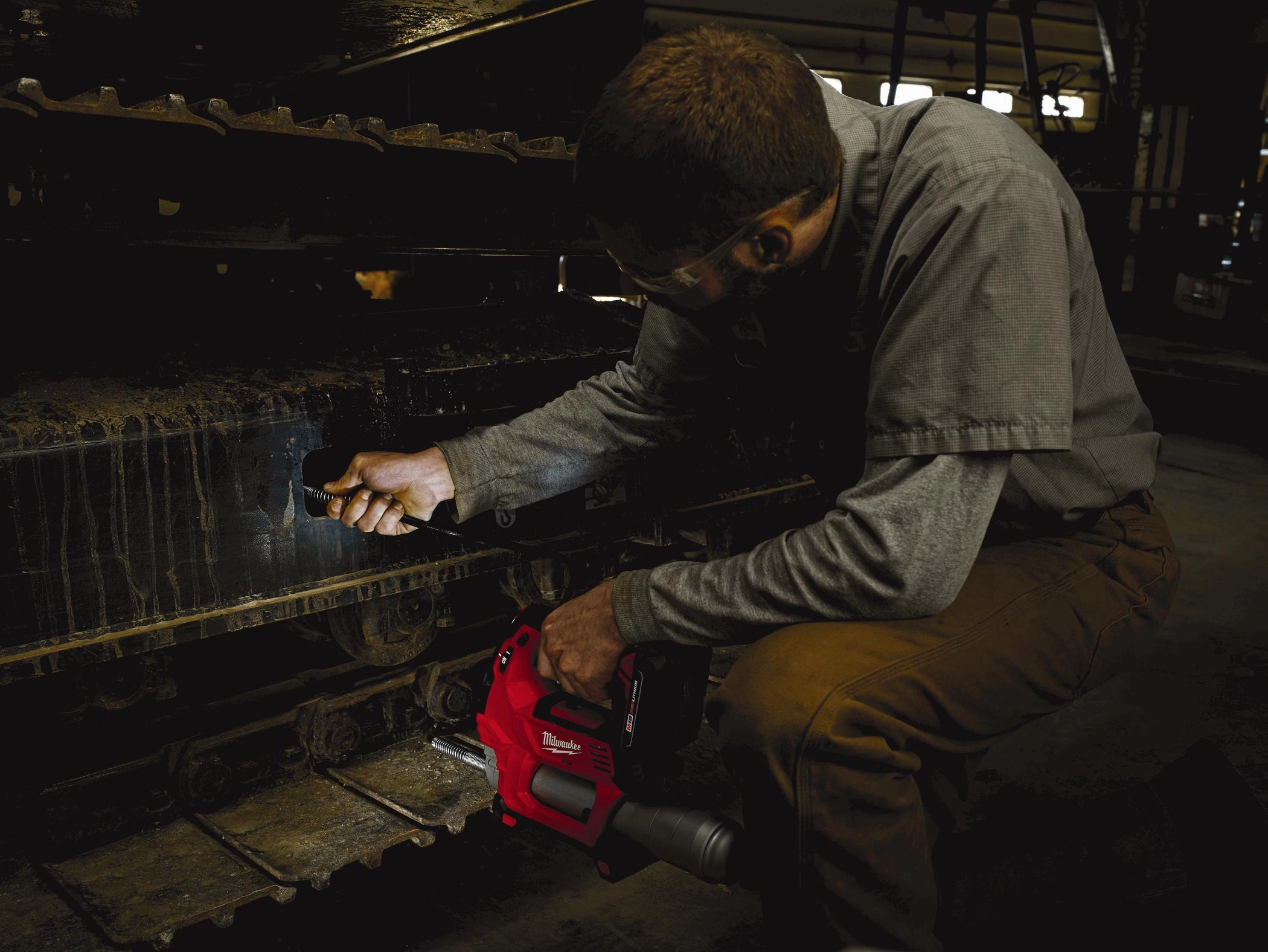 The M18™ Cordless 2-Speed Grease Gun delivers maximum pressure and unmatched versatility, offering an industry leading 10,000 PSI max operating pressure and a patent pending pre-set grease counter that allows service and maintenance professionals to dispense precise amounts of grease. The tool’s 2-speed design offers users the ability to select between max pressure and max flow rate. Other unique features include an on-board LED light, a lock-on/lock-off trigger, and a plunger rod with markings to gauge how much grease is left in the barrel. The tool’s stand up design and shoulder strap capability offer user convenience, while limiting fatigue and the 48” flexible hose offers greater accessibility when greasing hard to reach fittings. The new tool is also compatible with a clear barrel accessory (49-16-2646). Powered by an M18™ REDLITHIUM™ Battery pack, this is the industry’s only 18V grease gun that’s battery is compatible with a system of tools. The kit includes the new multi-voltage charger, so you can charge all M12™ and M18™ lithium-ion batteries with one charger.