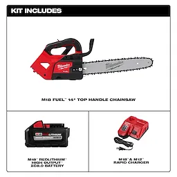 Our M18 FUEL™ 14" Top Handle Chainsaw Kit cuts faster than 35cc gas, delivers the power to cut hardwoods, and eliminates the headaches associated with gas engines. The saw is designed to meet the performance, durability, and ergonomic needs of the professional arborist, power utility linemen, and landscape maintenance professional. M18 FUEL™ technology allows the saw to reach full throttle in under 1 second providing ultimate control and cut faster than 35cc gas for increased application speed. The POWERSTATE™ Brushless Motor maintains speed under heavy loads without bogging down to outperform small gas engines and higher voltage systems. In addition to outperforming gas competitors, the saw eliminates all of the headaches associated with gas engines, such as pull starts, high noise levels, emissions, and regular maintenance. The REDLINK PLUS™ Intelligence enables full-circle communication between the tool and battery, providing you with unmatched levels of performance, protection, and productivity. Optimized for M18™ REDLITHIUM™ FORGE™ batteries delving 150 cuts per charge with an XC8.0 (included) and 225 cuts per charge with HD12.0 (not included) in cedar 4"x4". The saw has a professionally demanded feature set including an easy access chain tensioner, automatic oiler, metal bucking spikes, onboard scrench storage, lanyard loop, and climbing scabbard. The M18 FUEL™ 14" Top Handle Chainsaw is fully compatible with 250+ solutions on the M18™ system.