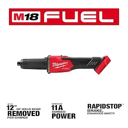 Our M18 FUEL™ Braking Die Grinder, Slide Switch, allows users to step up from their corded solutions by delivering 11A Corded Power, and the ability to remove up to 12" of weld bead on (1) M18™ 5.0ah XC Battery. Equipped with RAPIDSTOP™ technology that Provides Braking in under 2 seconds, our M18 FUEL™ Braking Die Grinder, Slide Switch, Provides Enhanced Safety while maximizing work done. The POWERSTATE™ brushless motor delivers 27,000 RPM and maximum power to allow our users to maintain grinding power while in the tightest of spaces. This cordless braking die grinder tool delivers up to 2" Accessory Compatibility for material removal and surface prep applications. Our Die Grinder features REDLINK PLUS™ Intelligence, the most advanced system of Cordless Power tool electronics for maximum performance and longest tool life.