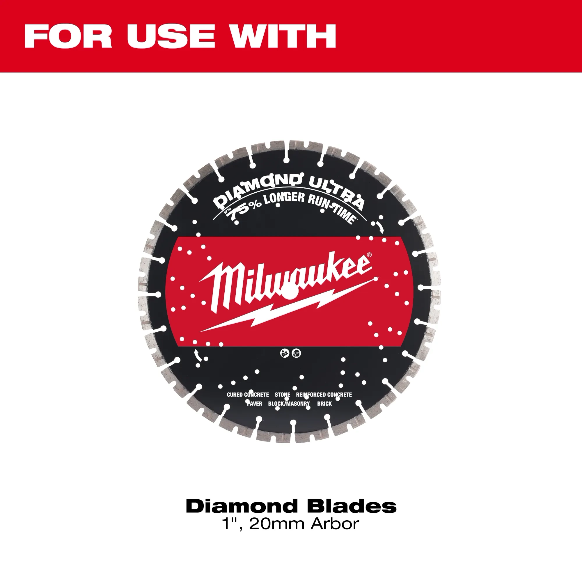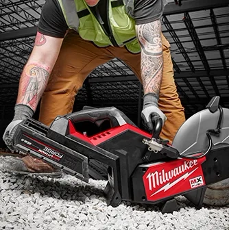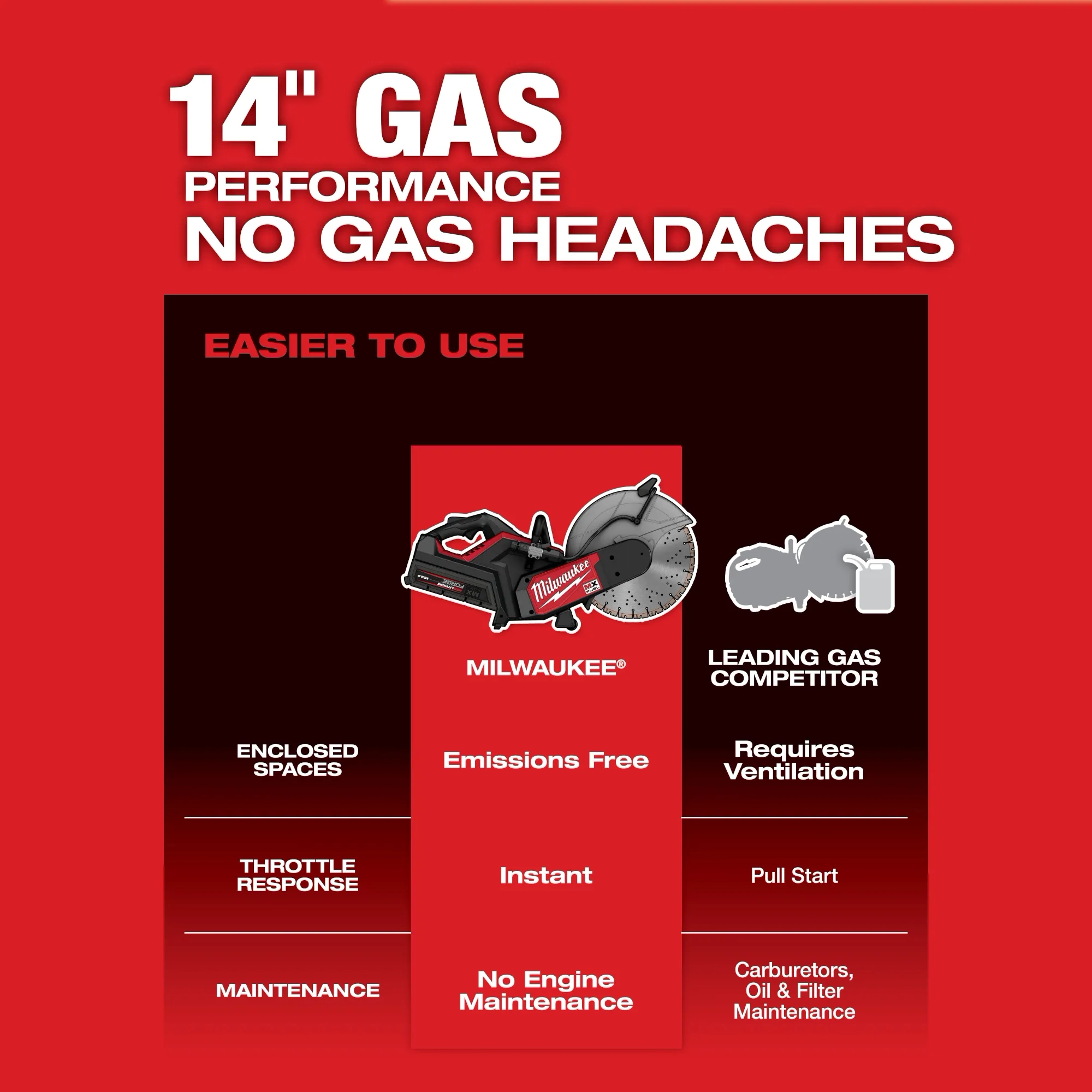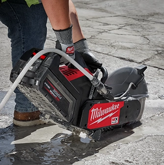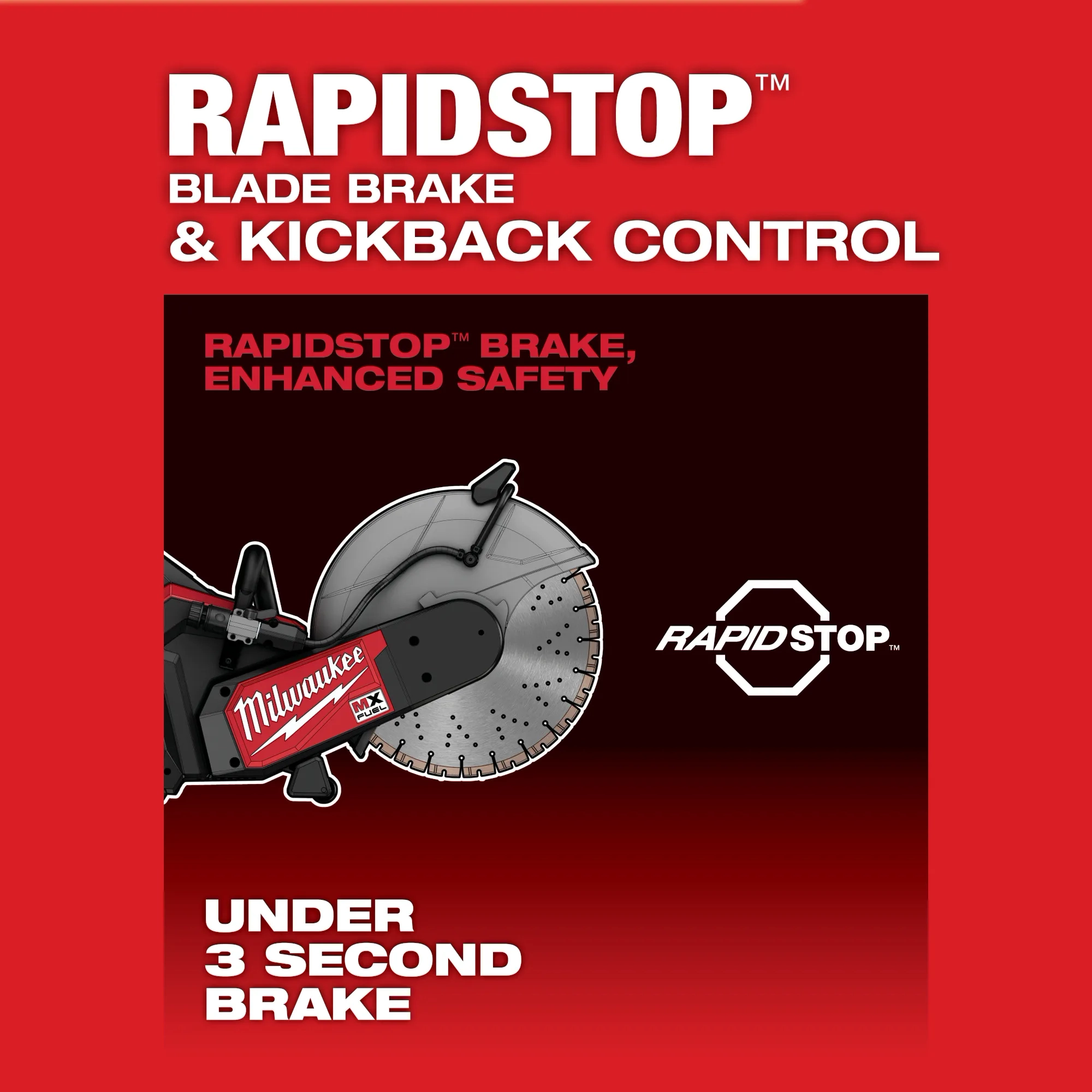 The MX FUEL™ 14 in. Cut-Off Saw w/ RAPIDSTOP™ Brake delivers 14” gas performance with no gas headaches. The POWERSTATE™ Brushless Motor delivers the power to cut tough materials like concrete, rebar, and ductile iron. It delivers instant power with push-button start and eliminates the repetitive motions of a pull start, providing faster cutting from start to finish. No gas engine means fewer wearable parts, less noise and vibration, and zero emissions for a safer workplace indoors or outdoors. RAPIDSTOP™ Blade Brake & Kickback Control provides enhanced safety by stopping the blade in three seconds during regular use and in cases of kickback. With (2) MX FUEL™ REDLITHIUM™ FORGE™ XC8.0 Batteries, it can cut 28 ft fully plunged in concrete or 240 cuts in #5 rebar. In just 45 minutes, you can charge an MX FUEL™ REDLITHIUM™ FORGE™ XC8.0 to 100%. Both the MX FUEL™ REDLITHIUM™ FORGE™ XC8.0 Battery & MX FUEL™ Super Charger are COOL-CYCLE™ Capable. COOL-CYCLE™ Active Cooling System provides high-speed cooling for less downtime. . The REDLINK PLUS Intelligence ensures optimal tool performance and provides overload protections during tough applications. The Saw is ONE-KEY Compatible: Track, manage, and secure equipment from your mobile device or computer. The saw includes a load light indicator that optimizes runtime and blade life, as well as an electric onboard water connection that releases water only when the trigger is released, reducing mess onsite.