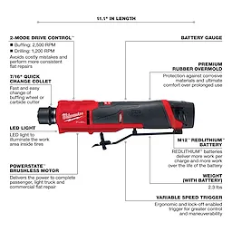 Our M12 FUEL™ Low Speed Tire Buffer Kit is the world's first cordless tire buffer, delivering performance, control, and runtime to replace pneumatic solutions in the shop. With our MILWAUKEE® POWERSTATE™ Brushless Motor, this tire repair tool provides the performance and size professional tire technicians demand. The tire buffer has the power to complete passenger, light truck, and commercial flat tire repairs. With 2-Mode Drive Control™, you can avoid costly mistakes by performing consistent flat tire repairs with a dedicated Buffing and Drilling mode. With the runtime to perform up to 30 flat tire repairs on a single XC4.0Ah battery, this tire buffer increases productivity with less downtime. This cordless tire buffer provides you with greater access and mobility, eliminating the frustrations of hoses and compressors.