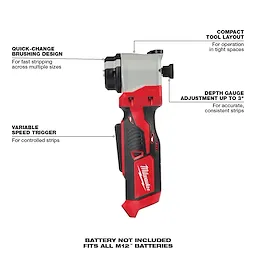 Our M12™ Cable Stripper vastly improves the cable stripping experience. With no exposed blades, the cordless cable stripper provides safer stripping than with a knife. The cable stripper's compact, right-angle design allows you to maneuver it more easily in tight spaces with less strain on the wrist. The bushing design and adjustable depth gauge deliver cleaner, more accurate and consistent strips across all sizes. The cable jacket stripping tool is not only compatible with all MILWAUKEE® bushings but is also compatible with competitive quick-change bushings.