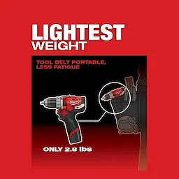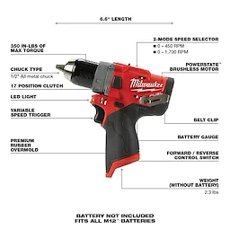 The M12 FUEL™ Drill Driver is the Most Capable, Lightest Weight, Most Compact tool in its class. The POWERSTATE™ Brushless Motor delivers the power to do a wide variety of applications at 1700 RPM’s and 350in.lbs. of torque. Weighing only 2.3lbs it is extremely portable, great for overhead applications, reduces fatigue throughout the day. At 6.6" in length this tool has the best access in tight spaces. REDLINK™ Plus intelligence protects the tool from overloads and overheating while ensuring maximum performance. Using REDLITHIUM™ 2.0Ah compact and 4.0Ah extended capacity battery packs they deliver more work per charge and more work over the life of the pack than competitive batteries.