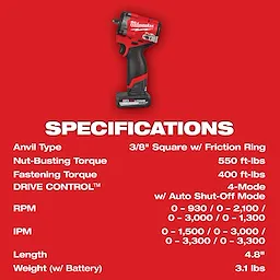 Our new 3/8” Stubby Impact Wrench delivers the Most Power, Is Lighter Weight & More Compact while delivering 50% Faster Application speeds. The POWERSTATE™ Brushless Motor Delivers 0-3,000 RPM with up to 550 ft-lbs of Nut Busting Torque, allowing the removal of the most corroded and stubborn applications. Our solution delivers on performance and size, at only 2.2 lbs bare tool. Users will experience less fatigue throughout their work week while fitting into tight spaces and allowing access where larger impacts can't fit without using additional accessories or disassembling components to reach the desired fastener. Equipped with Tri LED work lights to illuminate your work area without the frustration of shadows. 4-Mode DRIVE CONTROL™ for greater precision and customization to your desired power output, including AUTO SHUT-OFF™ that applies no more than 15 ft-lbs of torque for hand-tight applications that prevent overtightening when in forward. In reverse, bolt removal mode will slow down the RPM once the bolt is free to prevent bolts from flying around your work area. To change the modes, it is a single-handed operation. By shifting the forward-reverse shuttle into neutral and double-tapping the trigger, you will be able to change modes effortlessly. Kitted with our M12™ REDLITHIUM™ HIGH OUTPUT™ XC5.0 Battery Pack that delivers 25% more power, runs 25% cooler, and is chemical resistant to protect against exposure to common oils, greases, and solvents.