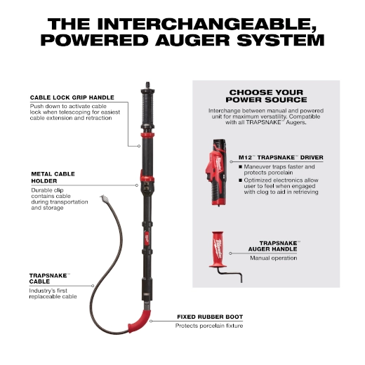 Powered By M12™ TRAPSNAKE™ Driver: Maneuvers traps faster and protects porcelain, compatible with all TRAPSNAKE™ Augers Patent
