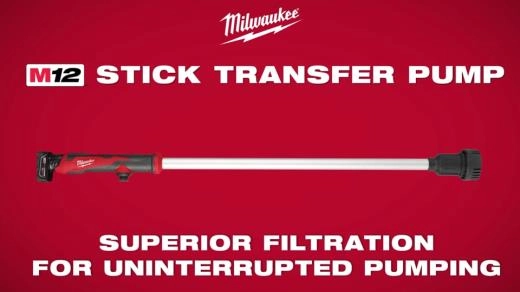 Our Milwaukee® M12™ Stick Transfer Pump delivers superior filtration for uninterrupted pumping in catch basins, water meter boxes, trenches, sump pump pits, and more. Featuring a 36” submersible aluminum barrel, this transfer pump provides the extension needed to reach water at the bottom of trenches and difficult to reach areas. Equipped with HydroPass™ filter technology, its 360° filter maximizes flow in heavy debris, minimizing downtime caused by clogging. Powered by our M12™ battery platform, this water transfer pump eliminates repetitive manual pumping and improves control, requiring only one hand to pump, freeing the other to control the outflow. With a 15ft max head height and an outlet compatible with a standard ¾” garden hose, this pump delivers the power to push water farther - out of pits and basins, over walls, and to the ideal deposit location. Compatible with all of our M12™ REDLITHIUM™ Batteries this pump keeps you productive, effortlessly pumping up to 9 gallons per minute and 275 gallons on (1) M12™ REDLITHIUM™ XC4.0 battery.