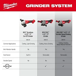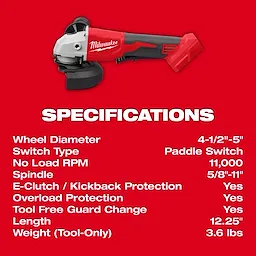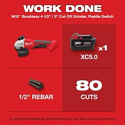 Our M18™ Brushless 4-1/2” / 5” Cut-Off Grinder delivers power and runtime while maintaining its compact size. The 11,000-rpm brushless motor was built and optimized specifically for cutting and surfacing applications. Paired with built-in REDLINK™ power tool technology and REDLITHIUM™ batteries, the Brushless Grinder provides efficient power delivery and longer battery life resulting in up to 80 cuts in ½” rebar. The Brushless Grinder’s body is 12.25" long and only 4.6 lbs with the XC5.0 battery attached. Our Brushless Grinder includes an electronic clutch for kickback protection, as well as overload protection to maximize motor life. With a 5/8”-11 spindle and tool-free guard adjustments, you will experience faster adjustments and less downtime, while remaining fully compatible with the most common grinder accessories in the market. The compact and light build allows for excellent control and comfort. The Brushless Grinder is built to last with an all-metal gear case, getting the job done every time.
