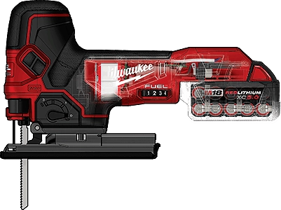 The M18 FUEL™ Barrel Grip Jig Saw combines power, blade speed and precision, to provide the highest quality cuts in a wide variety of materials. The M18 FUEL™ Barrel Grip Jig Saw leverages the POWERSTATE™ Brushless Motor and REDLINK PLUS Intelligence to provide higher blade speed than corded jig saws at 3500 strokes per minute for clean controlled cuts with minimized chipping or bucking. Leveraging the M18™ REDLITHIUM™ XC5.0 battery the M18 FUEL™ D-Handle Jig Saw provides up to 105 linear feet of cutting in ¾” laminated particle board, delivering all day productivity with less trips to the charger. The saw features tool-less blade change, tool free bevel adjust with detents at 0°; 15°; 30°; and 45° as well as an LED light and on/off blower to keep the cut line visible while cutting.