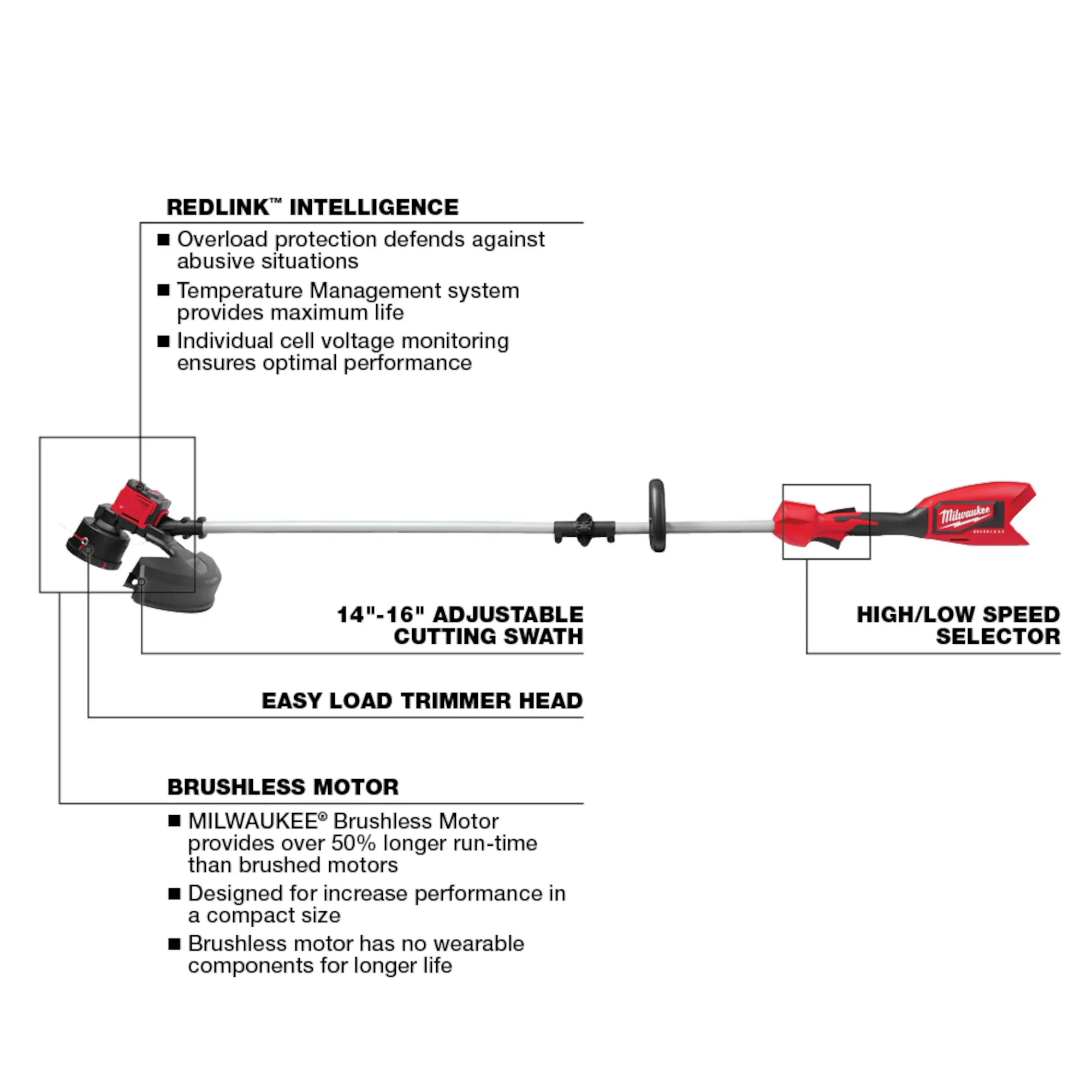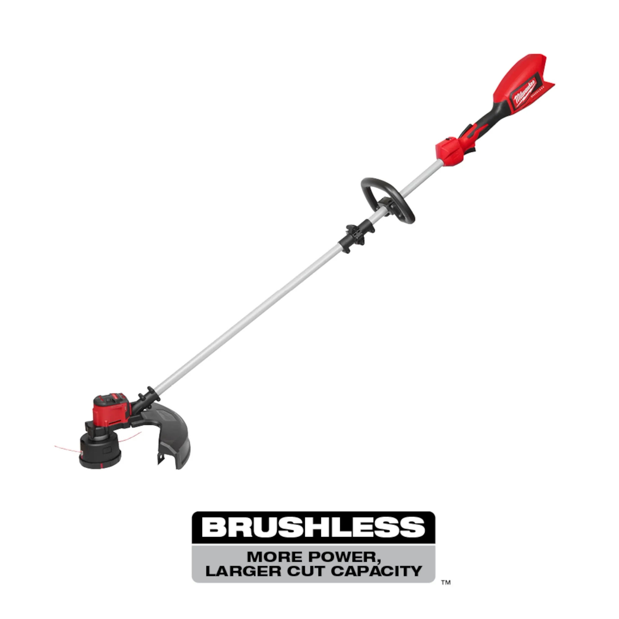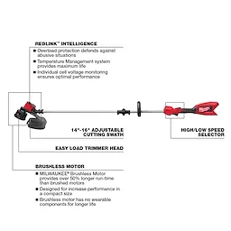 Our M18™ Brushless String Trimmer delivers you more clearing power and a larger cutting swath than battery-powered competitors. The brushless motor was built and optimized specifically for trimming applications and provides up to 6,200 RPM. Paired with REDLINK™ Intelligence and an M18™ REDLITHIUM™ HIGH OUTPUT™ battery, the trimmer provides efficient power delivery, providing you with longer run-time. The trimmer features high and low speed settings with a variable speed trigger. High-speed provides the power to take on demanding applications, and low-speed maximizes run-time while having plenty of power for grass trimming. The 16" cutting swath trims more grass in a single pass, which increases your productivity. The Easy Load Trimmer Head delivers an easy line loading experience and the ability to load up to 25' of trimmer line in under 30 seconds. This MILWAUKEE® cordless string trimmer is a part of the M18™ System, which is fully compatible with over 200 solutions.