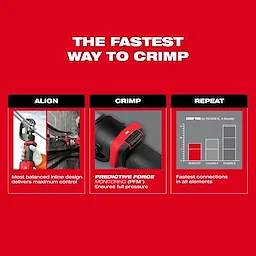 Our M18™ FORCE LOGIC™ 12T Kearney Linear Crimper is The Fastest Way To Crimp. Equipped with fully enclosed high-speed hydraulics, a POWERSTATE™ Brushless Motor, REDLINK™ Electronics, and REDLITHIUM™ Batteries, the 12-ton crimper provides the fastest application speed and unmatched reliability in the toughest conditions. The crimper's linear design and 340° of head rotation allow for one-handed use in multiple orientations. An enlarged trigger and electronic release button enable both left and right-handed users to easily operate the tool while wearing Class 3 gloves. Pull pin die retention system allows for fast, toolless die changes. Predictive Force Monitoring (PFM™) constantly measures output force to deliver the fastest crimp speeds across all connector types and sizes and ensures full pressure is reached every time. A pre-crimp battery check confirms that the battery has enough charge to complete a full crimp. Full compatibility with all industry-standard Kearney dies allows you to use the dies already on your truck. Our crimper is integrated with our ONE KEY™ Technology, giving the crimper the ability to store real-time crimp data.