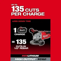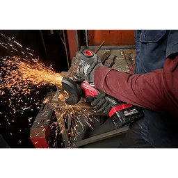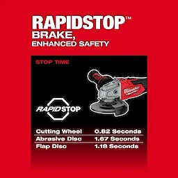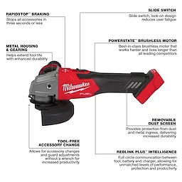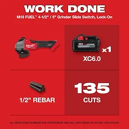 Our M18 FUEL™ 4-1/2" / 5" Braking Grinder Slide Switch, Lock-On is the next advancement in power and performance, generating 11A corded power, fastest cutting, and delivering up to 135 cuts per charge. The M18 FUEL™ 4-1/2" / 5" Braking Grinder generates 11A corded power allowing you to complete the toughest grinding and cutting applications, all on the M18™ cordless system. The POWERSTATE™ Brushless Motor delivers maximum sustained power and 8,500 RPM to remove material faster and increase productivity. REDLINK PLUS™ Intelligence ensures unmatched levels of performance, protection, and compatibility. The RAPIDSTOP™ Brake stops all accessories in 2 seconds or less. The M18 FUEL™ 4-1/2" / 5" Braking Grinder includes an electronic clutch for kickback protection, as well as overload protection to maximize motor life. The M18™ REDLITHIUM™ HIGH OUTPUT™ XC6.0 Batteries (not included) deliver 50% more power while running 50% cooler than our M18™ REDLITHIUM™ XC Batteries and are compatible with 200+ Tools in the M18™ System. With tool-free accessory and guard adjustments, you will experience faster accessory changes, and less downtime, while remaining fully compatible with the most common accessories in the market. The MILWAUKEE® M18 FUEL™ 4-1/2" / 5" Braking Grinder takes cordless grinders to the next level in performance and run-time.