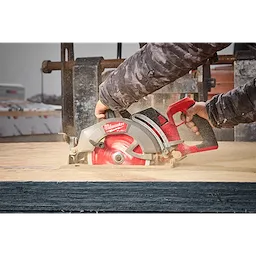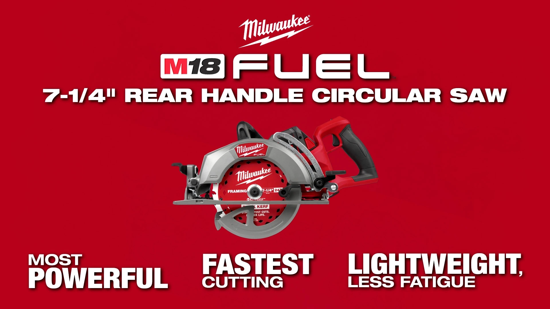 Designed for the professional carpenter, remodeler, and general contractor, the M18 FUEL™ 7-1/4" Rear Handle Circular Saw from MILWAUKEE® delivers class-leading performance. Utilizing the latest in cordless technology, this saw provides users with the power to complete more demanding applications and the cut speed to achieve greater productivity. The POWERSTATE™ Brushless Motor provides this worm drive style saw with 6,000 RPM, maintaining high speed under load, providing users the ability to complete their most demanding applications efficiently. Breakthrough advances in REDLINK PLUS™ Intelligence ensure maximum tool performance and protection from overload, overheating, and over-discharge. Paired with the M18 REDLITHIUM™ FORGE™ HD12.0 Battery, this saw provides up to 700 cuts per charge while maintaining full compatibility with all M18 REDLITHIUM™ batteries. This saw also comes with a 7-¼" 24T Thick Kerf Framing Circular Saw Blade, offering the straightest cuts and longer life. The lightweight and compact design, paired with premium ergonomics, makes this saw perfect for all-day use on the job site. For added productivity, this saw contains positive bevel detents and depth detents. A multi-sized rafter hook allows you to store the saw on different materials. Additionally, the saw has an electric blade break, rotational dust port, LED work light, and all magnesium guards and shoe, keeping you productive and providing durability to handle the toughest job site conditions.