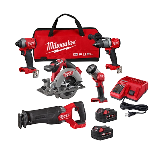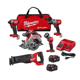 Our M18 FUEL™ 5-Tool Combo Kit delivers you the most advanced 18-volt cordless drilling, fastening, and cutting technology in the industry. This kit features five M18 FUEL™ 18-Volt Lithium-Ion brushless cordless tools, including a ½" a hammer drill, ¼" impact driver, SAWZALL® reciprocating saw, 6-1/2 circular saw and LED work light. M18 FUEL™ is fully compatible with the MILWAUKEE® M18™ cordless system, featuring over 200 solutions. M18 FUEL™ features the most advanced cordless technology in the industry; a POWERSTATE™ Brushless Motor, REDLINK™ PLUS Intelligence and REDLITHIUM™ Battery Technology, resulting in longer motor life, longer run time, and more power.
