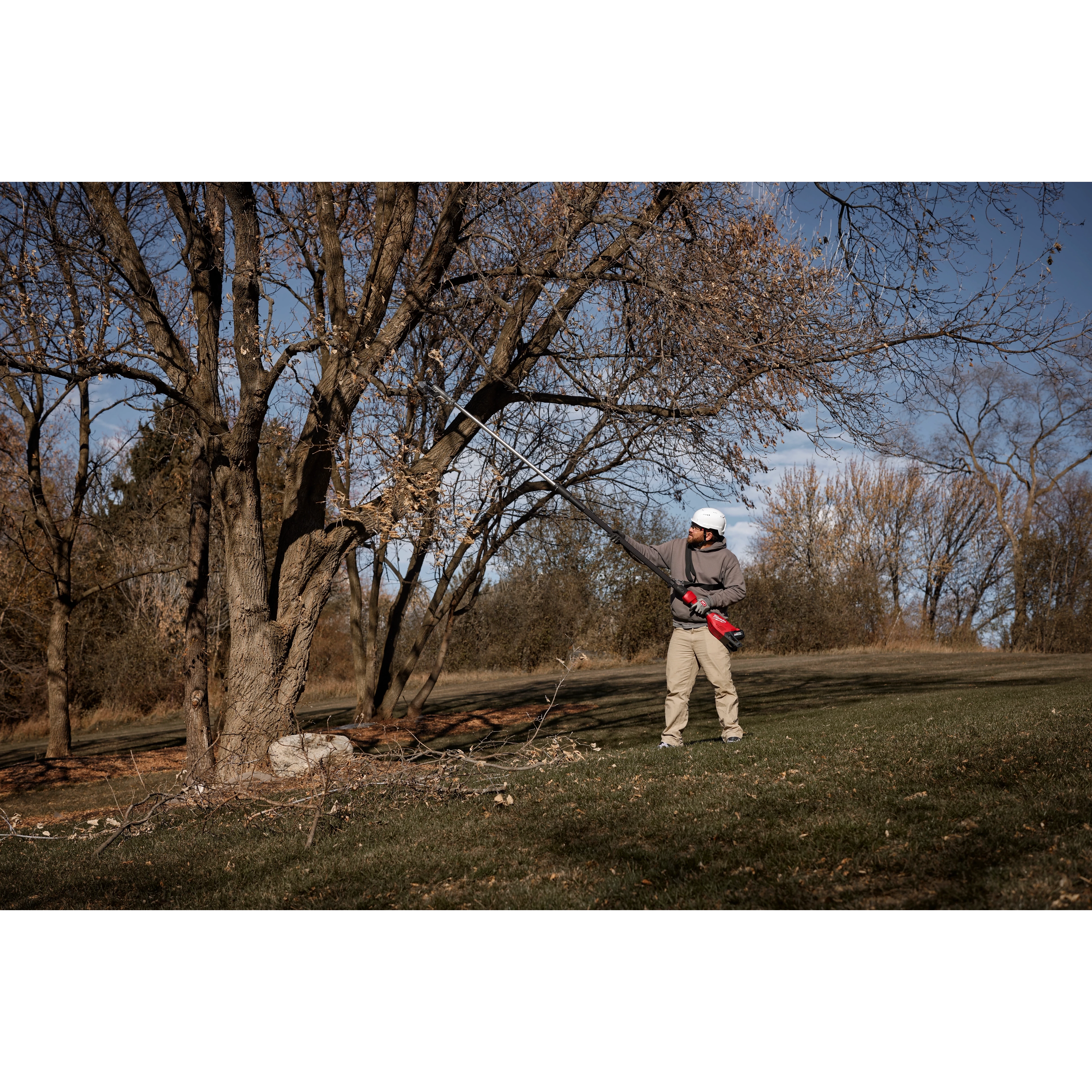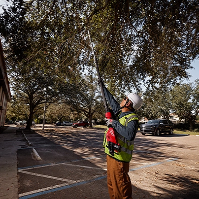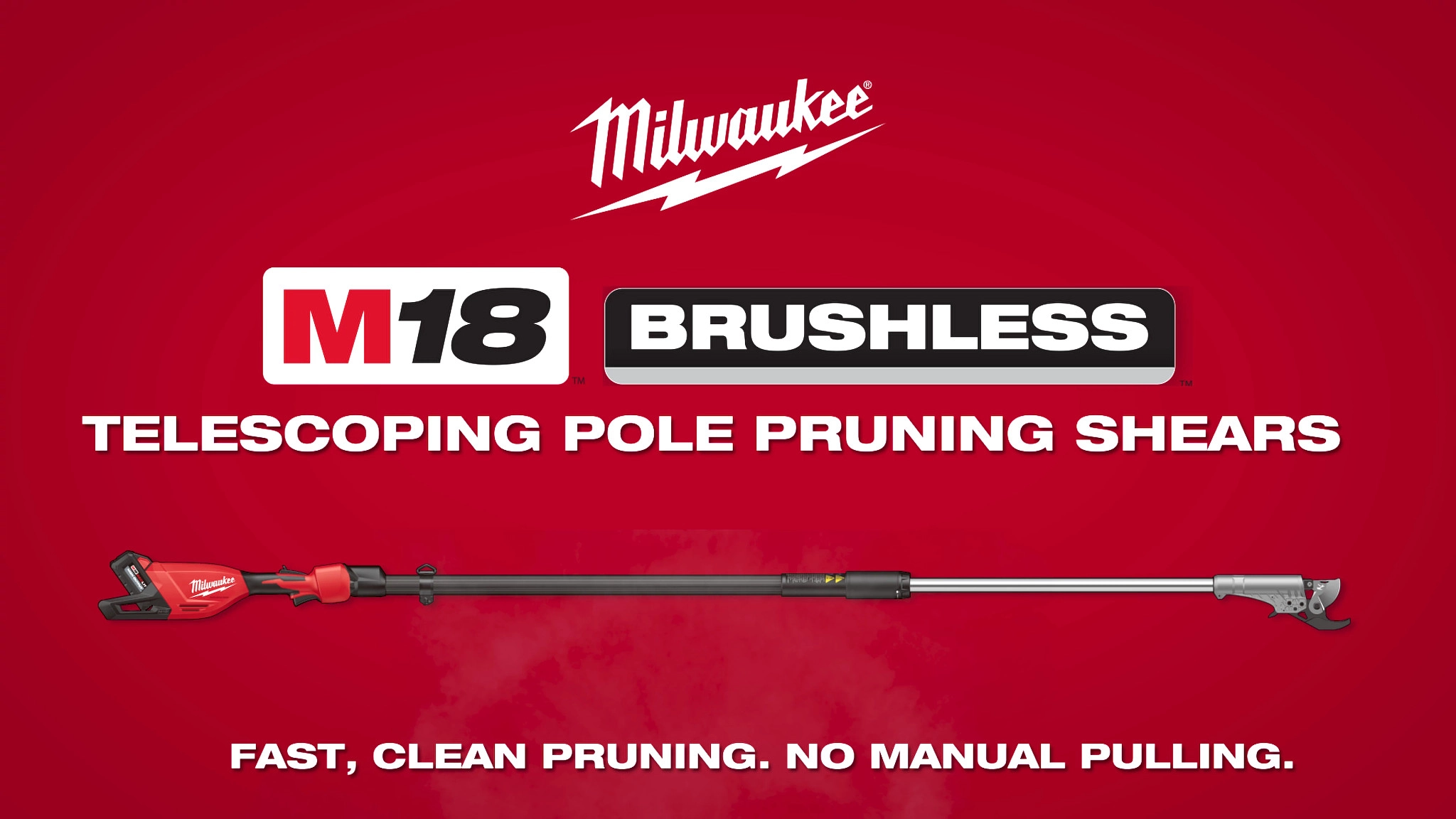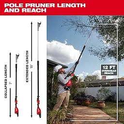 Our M18™ Brushless Telescoping Pole Pruning Shears provide fast, clean pruning, and eliminate the repetitive pulling associated with manual units. The telescoping pole pruning shears' Brushless motor gives the ability to make clean and precise bypass pruning cuts in branches in up to 1-3/4” diameter with minimal effort. Our telescoping pole pruning shears feature an ergonomic adjustment collar that allows users to telescope quickly from 7ft to 10ft in length. The M18™ Brushless Telescoping Pole Pruning Shears reduces peak muscle activation up to 80% and completes challenging applications up to 3X faster than manual solutions. When paired with our M18™ REDLITHIUM™ HIGH OUTPUT™ XC6.0 Battery Pack (not included), the telescoping pole pruning shears can complete up to 2,000 cuts per charge in 1” branches. Our M18™ Brushless Telescoping Pole Pruning Shears are fully compatible with 250+ solutions in the M18™ system.