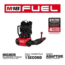 Our M18 FUEL™ Dual Battery Backpack Blower is designed for outdoor trades, delivering a higher blowing force than up to 60cc gas. The POWERSTATE™ Brushless Motor Delivers a constant 650 CFM, 155 MPH, and 20.5 Newtons of blowing force and reaches full throttle in under one second, boosting productivity and control. The blower requires (2) M18™ REDLITHIUM™ Batteries for operation while providing (2) additional battery terminals to extend runtime. When using the included (4) M18™ REDLITHIUM™ HIGH OUTPUT™ 12.0 Batteries, the blower delivers 30 to 60 minutes of continuous use based on the selected mode. This adjustable battery setup allows the operator to adapt the number of batteries for either lighter weight in quicker clean-ups or longer runtime in extended clearing applications. With a customizable battery configuration combined with a fully adjustable harness, mode select, telescoping nozzle, variable speed trigger, and low noise level of just 62dB(A) this backpack blower provides the most adaptive design and comfort to meet the wide range of application and operator needs. Our M18 FUEL™ Dual Battery Backpack Blower is part of the M18™ System, fully compatible with over 250+ solutions.