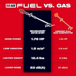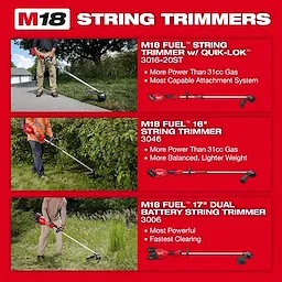 Designed to meet the needs of landscape maintenance professionals, our M18 FUEL™ String Trimmer w/ QUIK-LOK™ provides you with more power than 31cc gas trimmers and reaches full throttle in under 1 second and is part of the industry's most capable attachment system. The split boom cordless string trimmer is made up of two components – the M18 FUEL™ Power Head w/ QUIK-LOK™ and QUIK-LOK™ String Trimmer Attachment. This allows you to quickly swap out any of the 13 attachments on a single power head, delivering ultimate versatility and a lower cost of ownership. The POWERSTATE™ Brushless Motor delivers you the power to maintain speed in demanding applications without bogging down. The motor is positioned in the rear of the trimmer to provide the best combination of power, balance, and maneuverability. The motor also has an advanced air-cooling system to sustain demanding applications for longer, increasing user productivity. REDLINK PLUS™ intelligence maximizes performance while protecting from overload, overheating, and over-discharge. The advanced electronic package also delivers instant throttle response, 3 speeds, and a variable speed trigger. The trimmer delivers best-in-class performance when paired with M18™ REDLITHIUM™ FORGE XC8.0 Battery (not included). The Easy Load Trimmer Head provides the ability to load up to 25' of trimmer line in under 30 seconds. Our M18 FUEL™ String Trimmer w/ QUIK-LOK™ is part of the M18™ system which is fully compatible with over 275 tools.