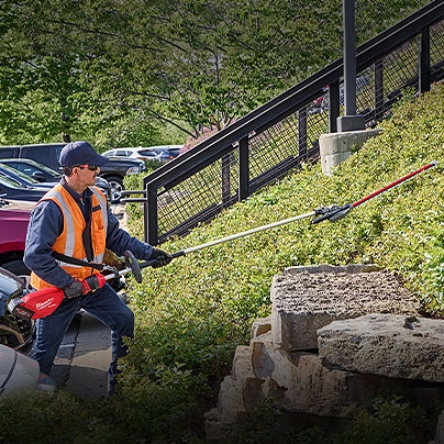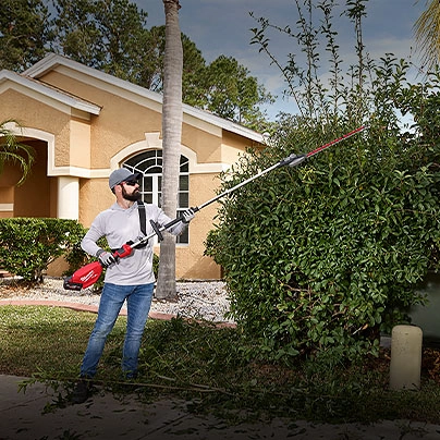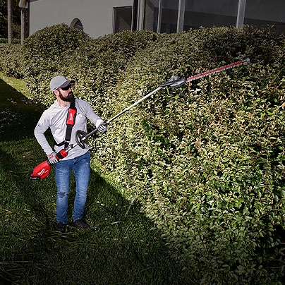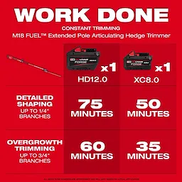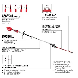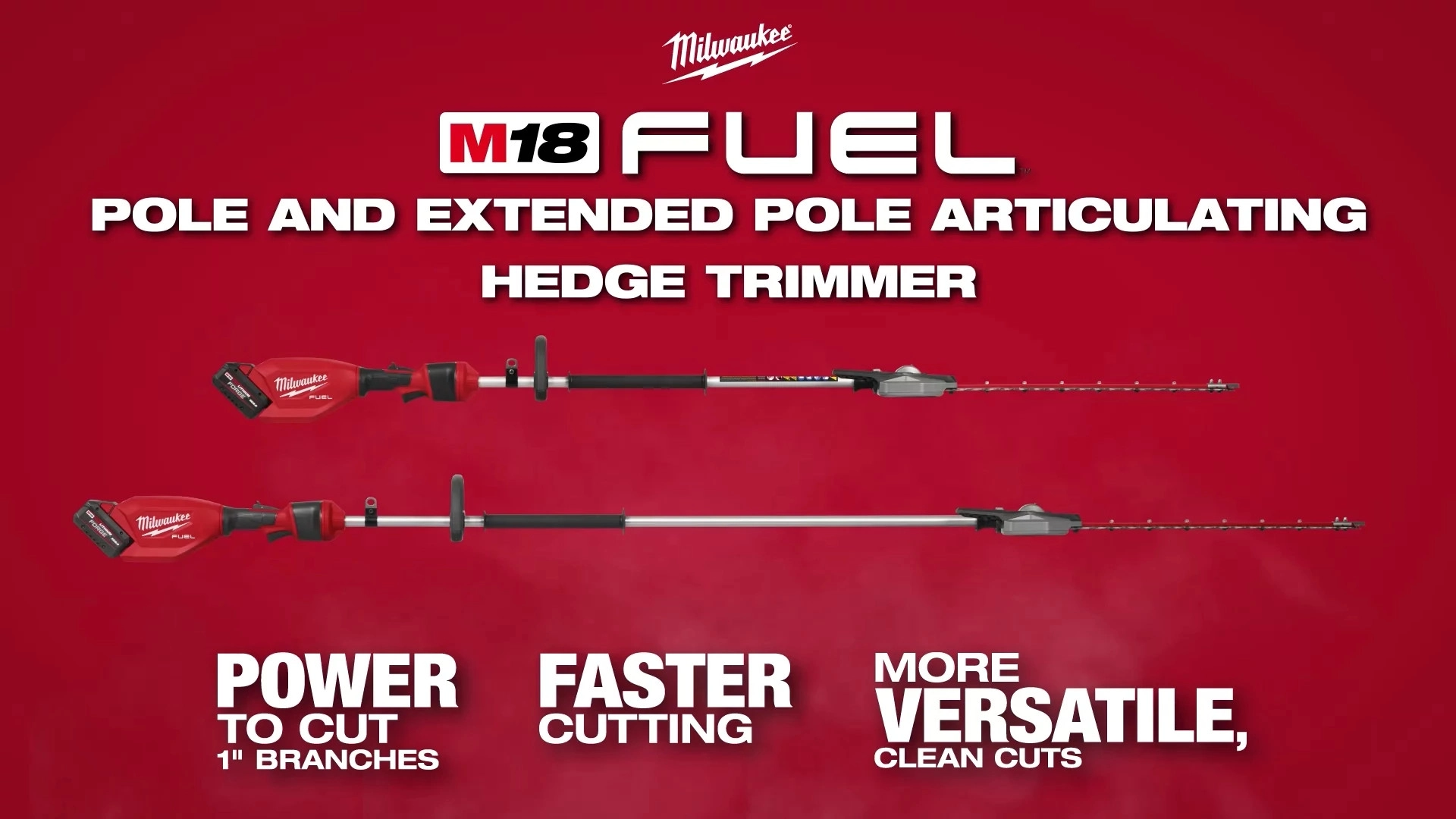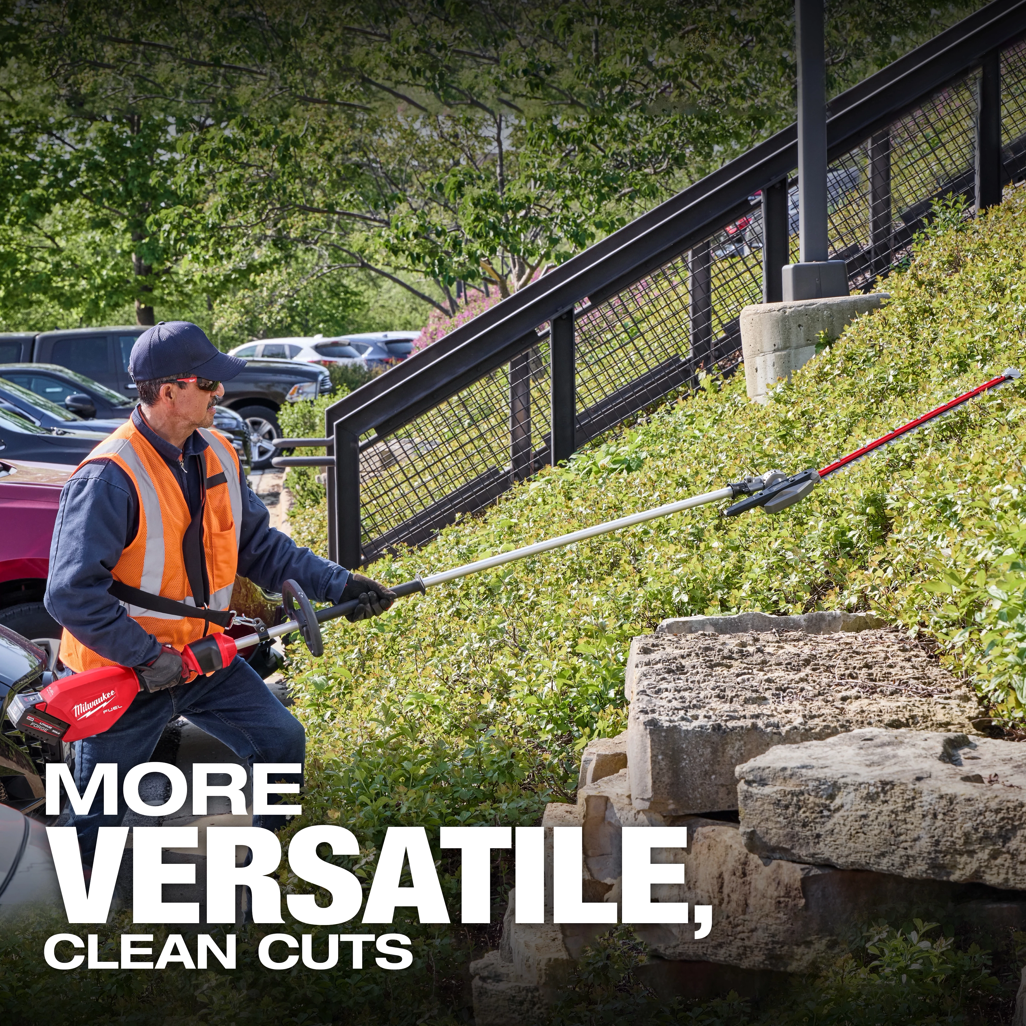 Our M18 FUEL™ Extended Pole Articulating Hedge Trimmer has the power to cut 1" branches, cuts faster, and provides more versatility for clean cuts. Designed to meet the needs of the landscape maintenance professional, this hedge trimmer leverages a POWERSTATE™ Brushless motor and 24" double-sided blades with a 1" blade gap, for faster more aggressive cutting. The cutting head allows for 270 degrees of blade articulation, giving users 12 operating positions and 1 storage position. The hedge trimmer includes a tip guard to prevent damage to the blade and surrounding work area, as well as a bail handle, padded grip, and 5-position rotating handle for optimal hand placement and increased comfort and control. This hedge trimmer's length with the REDLITHIUM™ FORGE™ XC8.0 Battery (Not Included) is 107". REDLINK PLUS™ Intelligence offers total system communication between tool and battery for unmatched levels of performance, protection, and productivity. The M18 FUEL™ Pole Articulating Hedge Trimmer is fully compatible with 275+ solutions on the M18™ system.