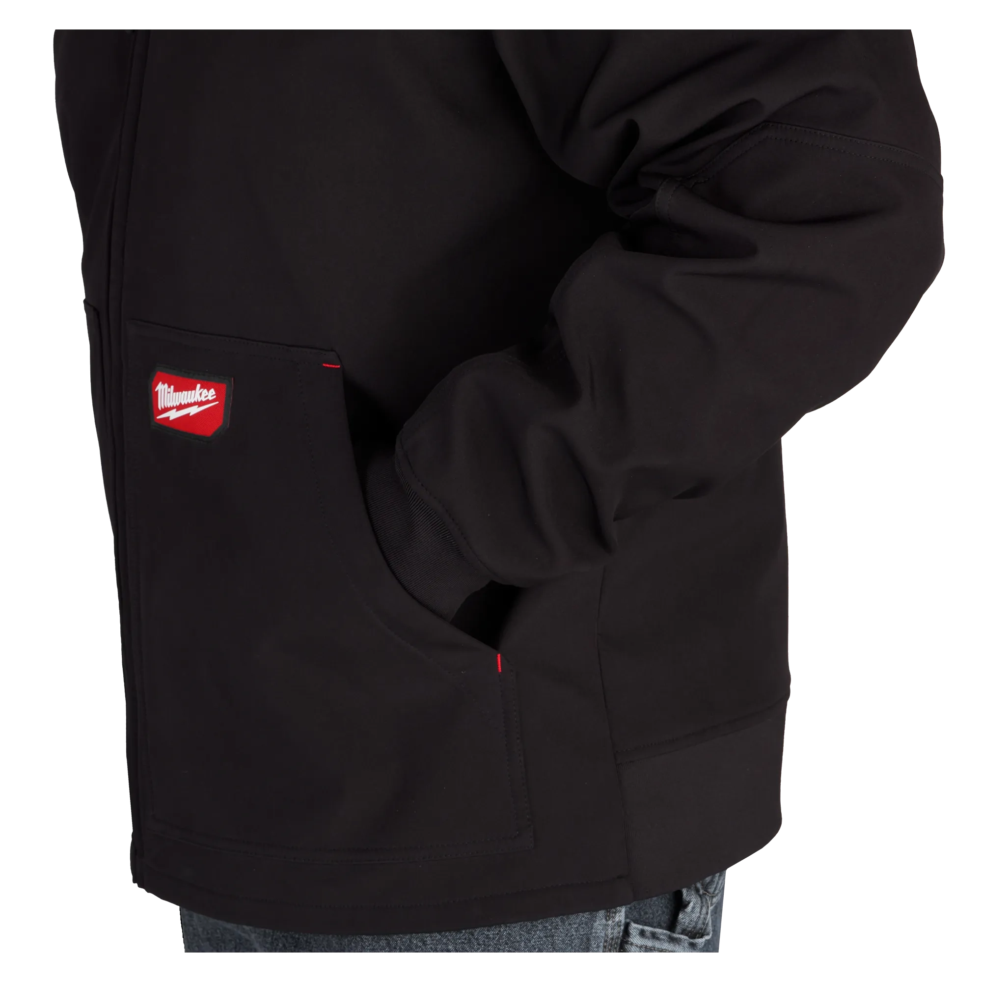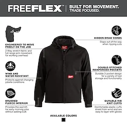 Part of the MILWAUKEE® FREEFLEX™ Collection, our Softshell Jacket is BUILT FOR MOVEMENT. Constructed from durable, lightweight stretch fabrics, the FREEFLEX™ Softshell Hooded Jacket delivers unrestricted movement when layering on the job from fall to spring. The Softshell Jacket is designed with a brushed fleece interior, wind and water-resistant shell, and tough elastic cuffs to outlast the job and keep you comfortable all day. Our Milwaukee® FREEFLEX™ products are developed in collaboration with feedback from users across the trades through continuous jobsite research.