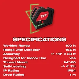 Our Green Cross Line Laser provides 8+ hours of runtime for all-day brightness and is powered by (4) AA batteries. The high-intensity laser beams allow our users to see the green lines up to 100' for fast and accurate leveling and alignment. The integrated magnetic bracket features amplified rare earth magnets for a stronghold on metal surfaces while the screw and nail hang holes make setup easy and efficient in any environment. Our Green Cross Line Laser is covered by a two-year warranty.