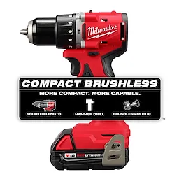 Our M18™ ½” Compact Brushless Hammer Drill/Driver is more compact and capable. The compact hammer drill is 5.8” in length and lightweight at 3.2 lbs with a battery, allowing for excellent control, especially while working in overhead or tight spaces. The brushless motor was built to ensure optimal tool performance delivering 550 in-lbs of torque and 0-1,700 RPM, able to tackle a wide range of applications like concrete drilling. REDLINK™ Intelligence paired with REDLITHIUM™ M18™ batteries ensures efficient power delivery resulting in less downtime recharging batteries. The cordless compact hammer drill has premium components with an all-metal gear case and ½” metal chuck providing the durability that professionals require. The kit includes the Hammer Drill/Driver, (2) M18™ REDLITHIUM™ CP2.0 Compact Batteries, M18™/M12™ Multi-Voltage Charger, and Contractor Bag. The Compact Brushless ½” Hammer Drill/Driver is part of the M18™ system, fully compatible with over 250+ solutions.