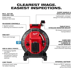 Our M18™ 120’ Mid-Stiff Pipeline Inspection System delivers the clearest image, easiest inspections for 2"-6” sewer lines up to 120’. Featuring the industry’s shortest 25 mm HDR self-leveling camera head, and the ability to digitally zoom up to 4X and pan, technicians can now see more in drain lines than ever before. Our HDR self-leveling camera heads allow you to see both up close and further down line with superior clarity, reducing washed out areas and highlights detail in dark conditions. Our pitch sensing feature reads and displays pitch on screen for easier diagnosis and more effective reporting. With the system’s compact design and removable backpack straps, transportation to any roof, drain, crawl space or cleanout has never been easier. Powered by M18™ REDLITHIUM™ 5.0 batteries, the M18™ 500GB Control Hub powers the reels, stores recordings, and easily swaps between reel sizes delivering unmatched system versatility. Capture, create, and share custom photos and videos from one of our compatible Pipeline Inspection viewing devices or directly from a tablet or mobile device for faster sharing of findings. This sewer line camera is also equipped with ONE-KEY™ Technology, providing you with the ability to track the tool's location, manage it in inventory, and lock the tool out to help protect your investment.