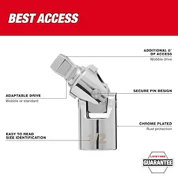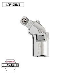 Our 1/2" Drive Universal Joint features a male square drive with wobble design, providing up to 8 degrees of additional movement for the best access. The adaptable drive is designed to provide the versatility of using in the standard fixed position or the wobble position. The universal joint is held together by a secure pin and has chrome plating for corrosion and rust protection. All Milwaukee® Mechanics Hand Tools are backed by a lifetime guarantee.