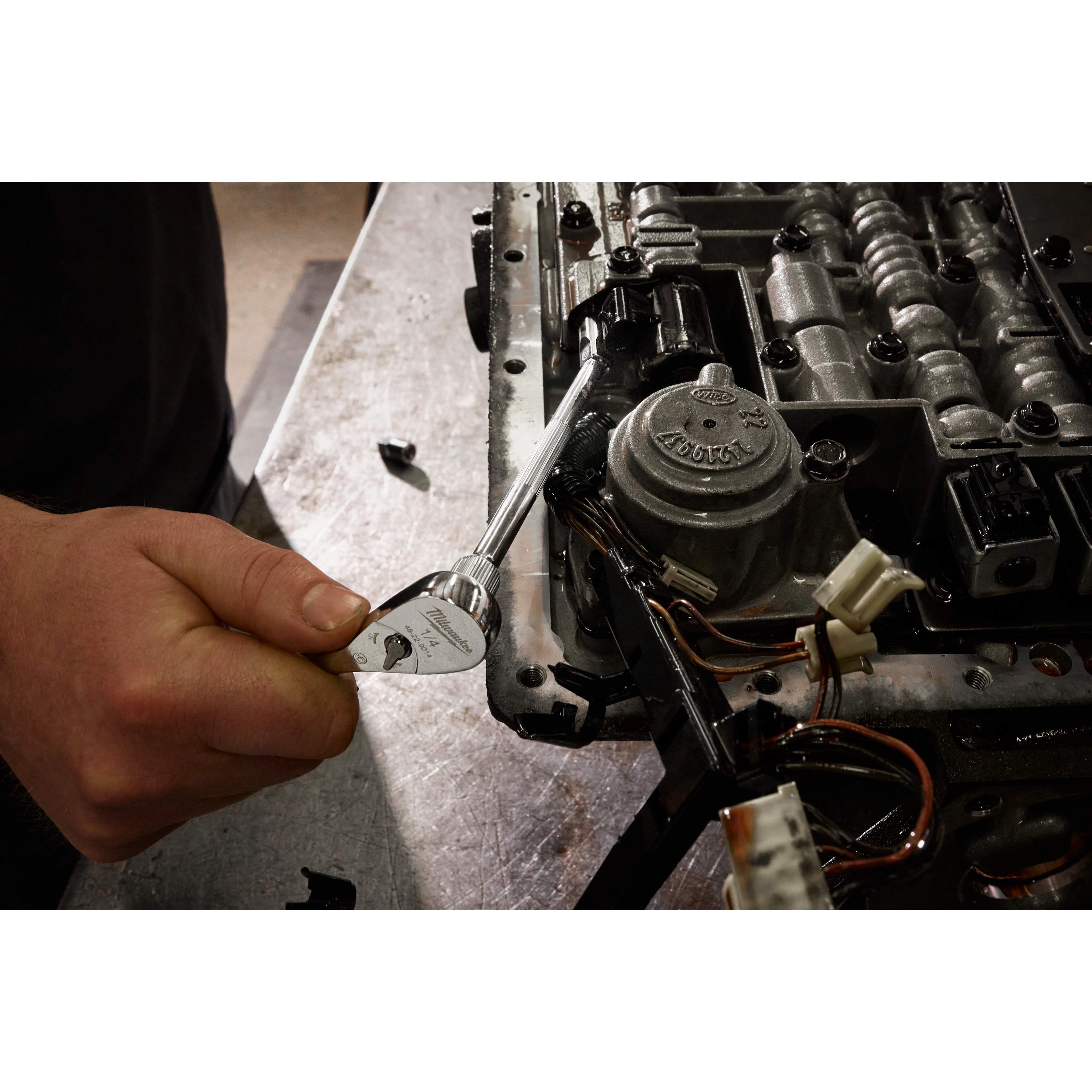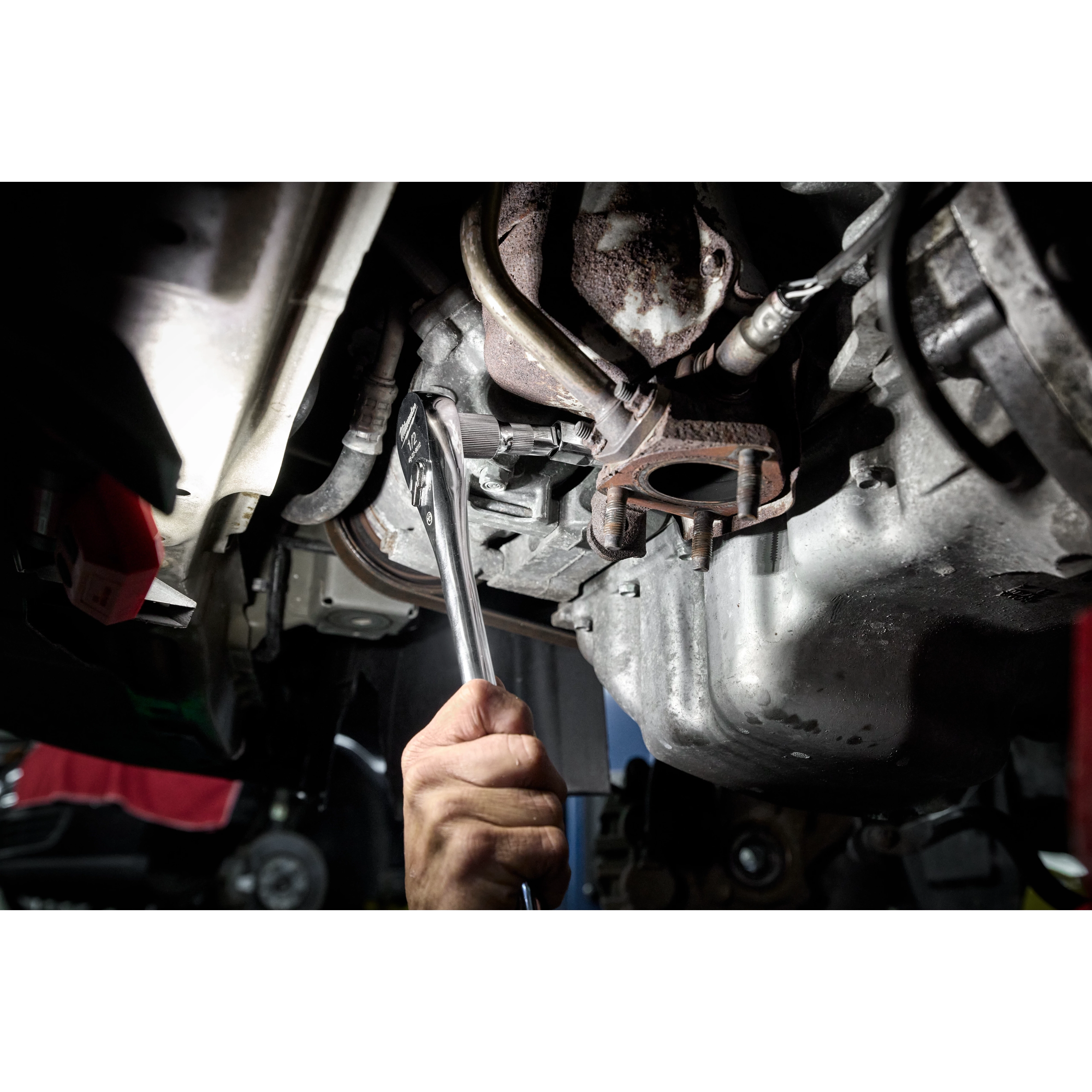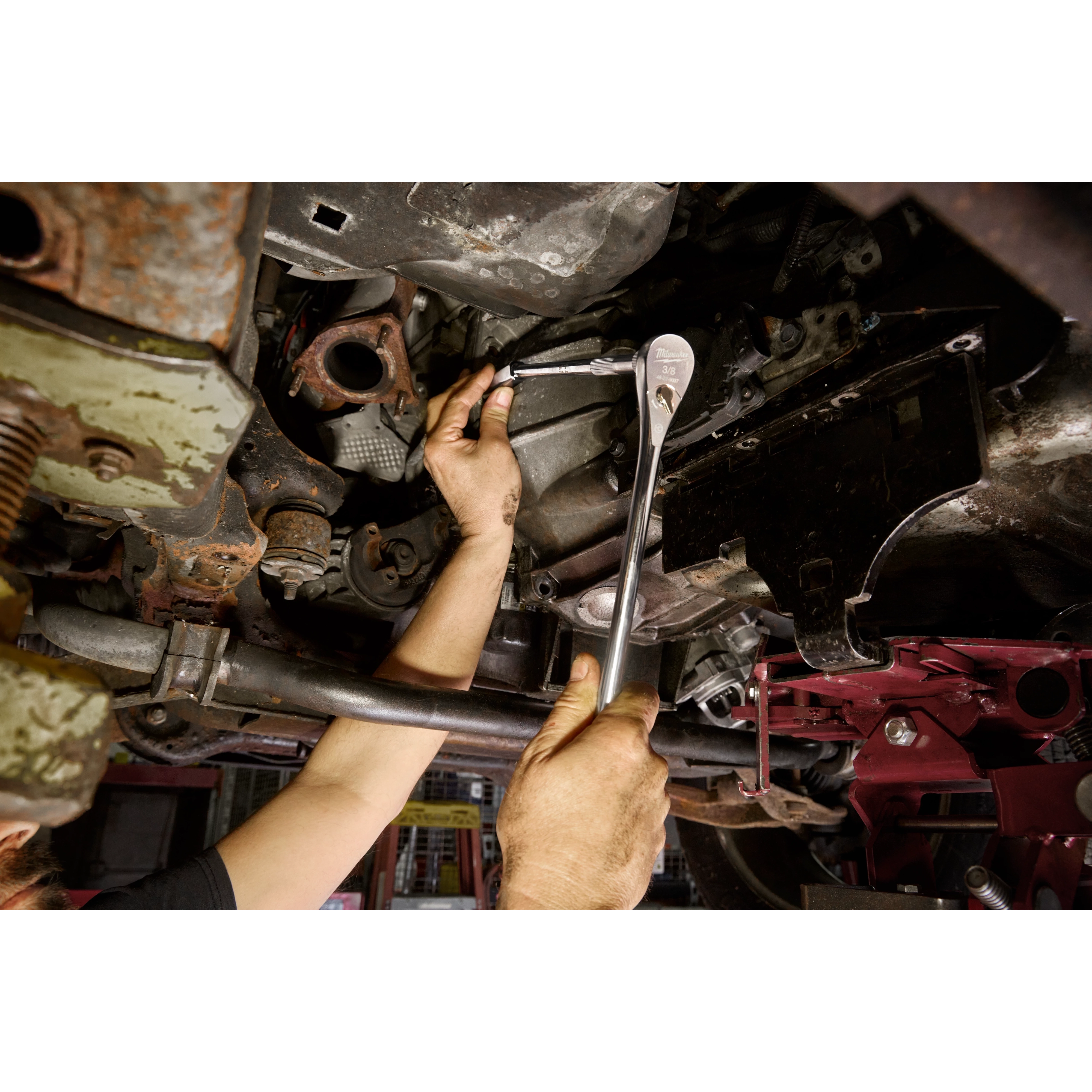 Our Wobble Extensions offer the most control and better access even in the tightest applications. The extensions feature the largest knurling surface on both the shaft and female drive end allowing precision control when hand-tightening or working with oily materials. The male square end features a wobble design, providing up to 11 degrees (1/4" drive); 15 degrees (3/8" drive); and 8 degrees (1/2" drive) of movement for better access at different angles and in tight spaces. The male end also provides added versatility by doubling as a standard or a wobble extension. The chrome plating on the extensions offers corrosion and rust protection. All Milwaukee® Mechanics Hand Tools are backed by a lifetime guarantee.