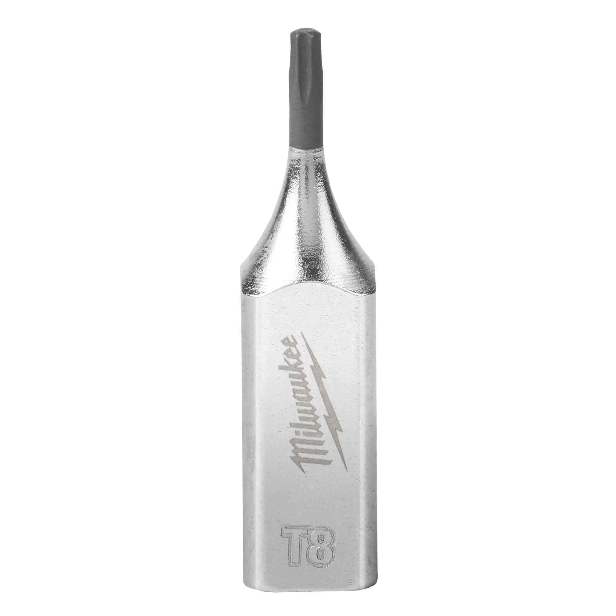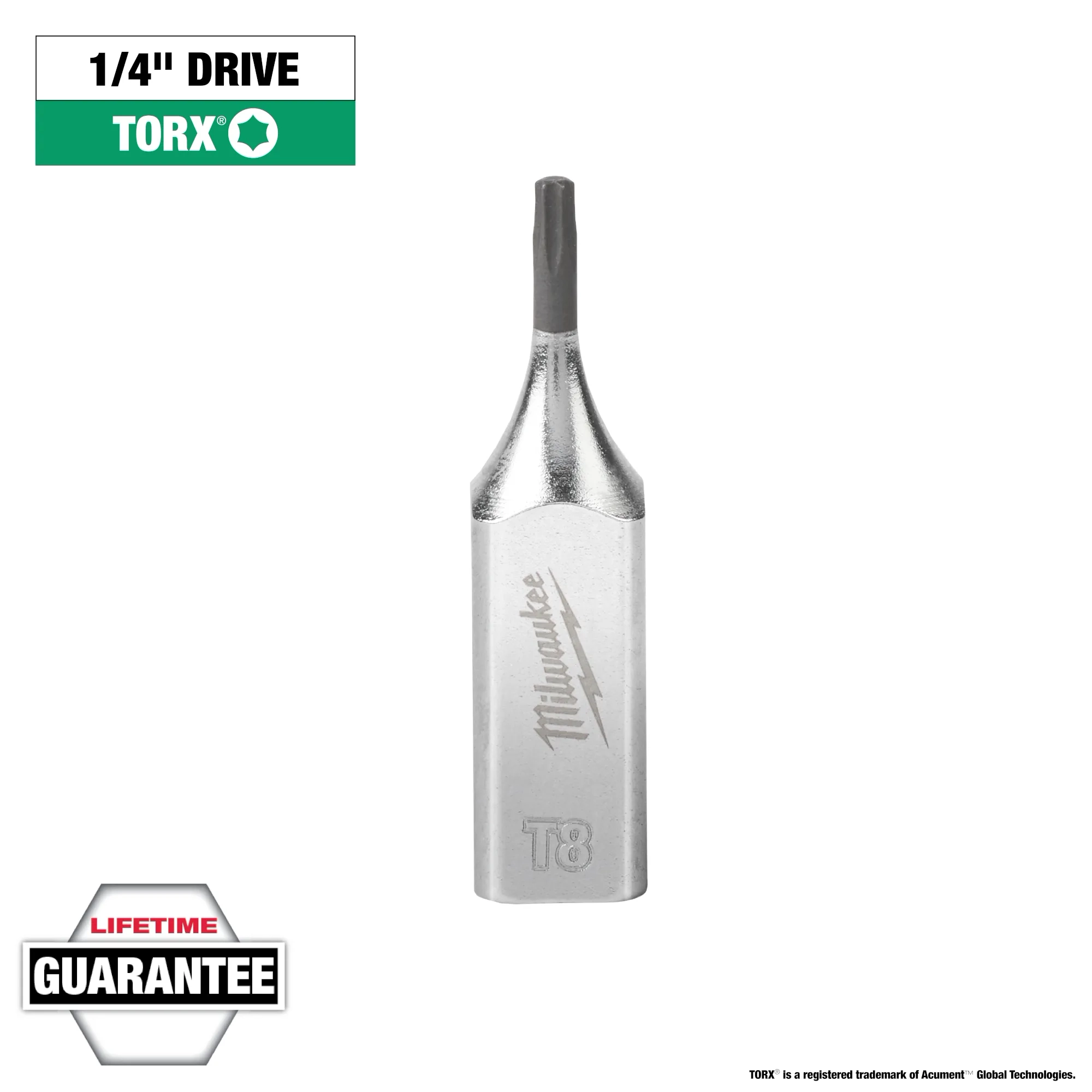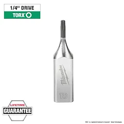 Our TORX® Bit Sockets with FOUR FLAT™ sides are designed from the ground up to be part of the most versatile socket family. Milwaukee® bit sockets feature an innovative design with four parallel flat sides, which deter rolling and are wrench-compatible. This also creates a slim profile to provide the best access in tight spaces. The one-piece socket design offers improved durability compared to two-piece designs by eliminating the risk of the bit separating from the socket base. Laser engraved size markings provide easy identification and chrome plating offers rust and corrosion protection. All Milwaukee® bit sockets are backed by a Lifetime Guarantee.