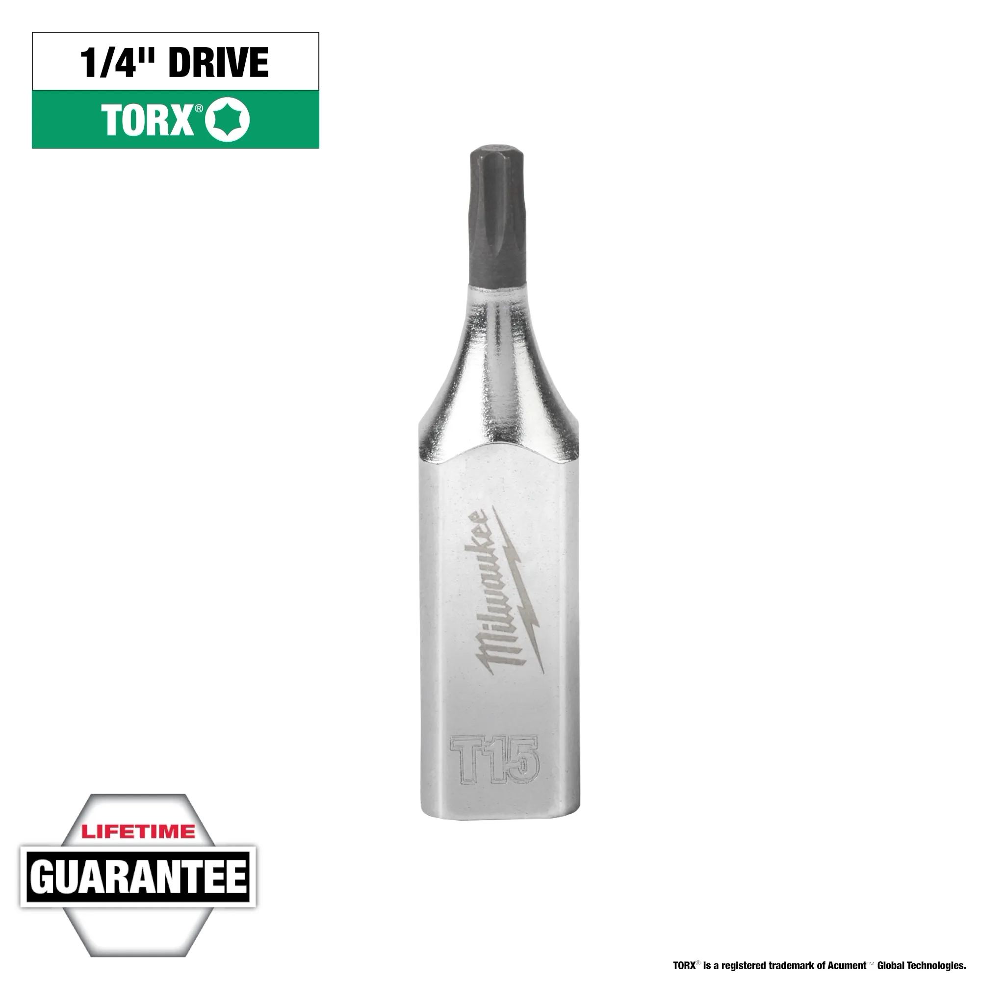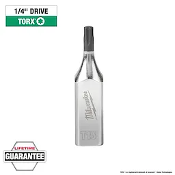 Our TORX® Bit Sockets with FOUR FLAT™ sides are designed from the ground up to be part of the most versatile socket family. Milwaukee® bit sockets feature an innovative design with four parallel flat sides, which deter rolling and are wrench-compatible. This also creates a slim profile to provide the best access in tight spaces. The one-piece socket design offers improved durability compared to two-piece designs by eliminating the risk of the bit separating from the socket base. Laser engraved size markings provide easy identification and chrome plating offers rust and corrosion protection. All Milwaukee® bit sockets are backed by a Lifetime Guarantee.