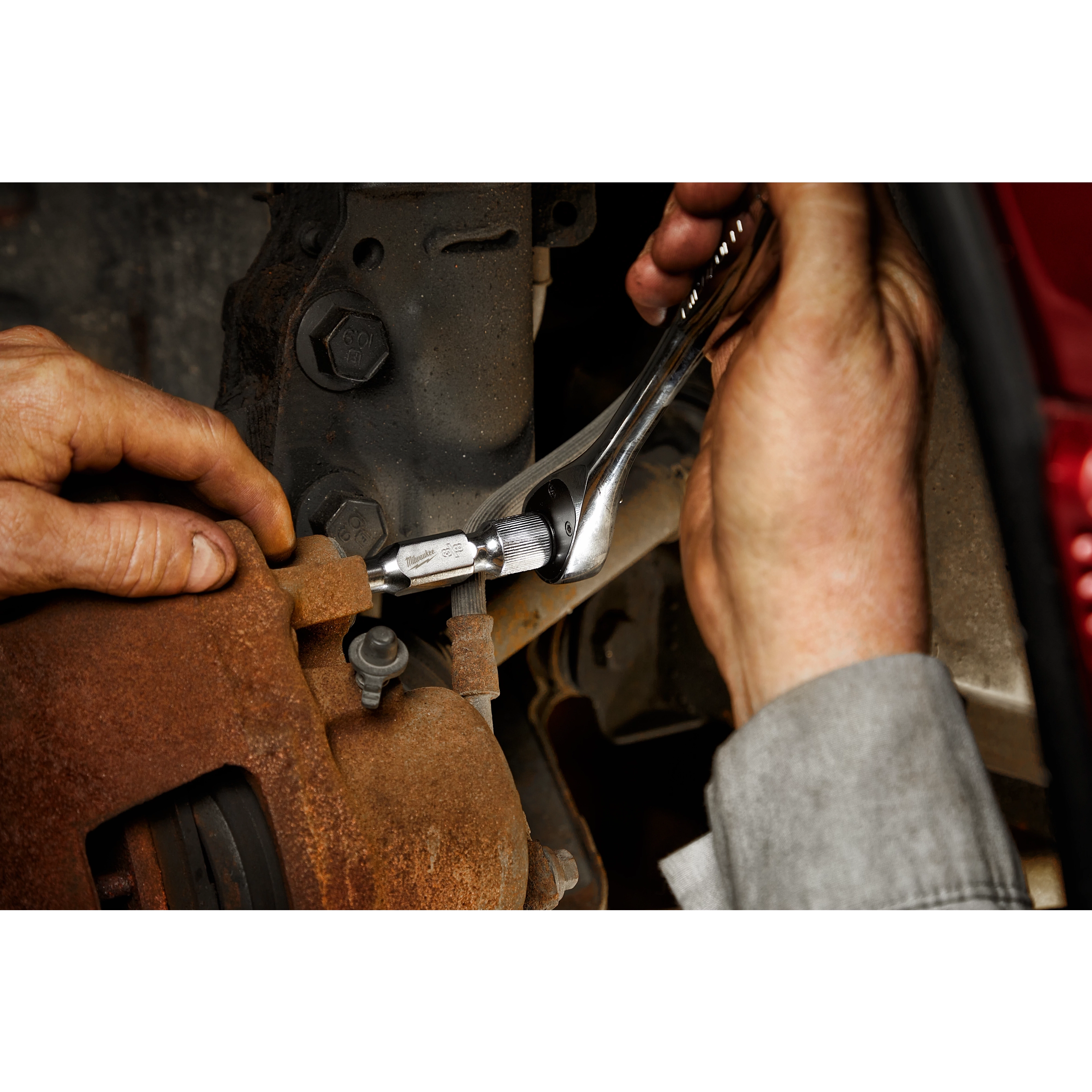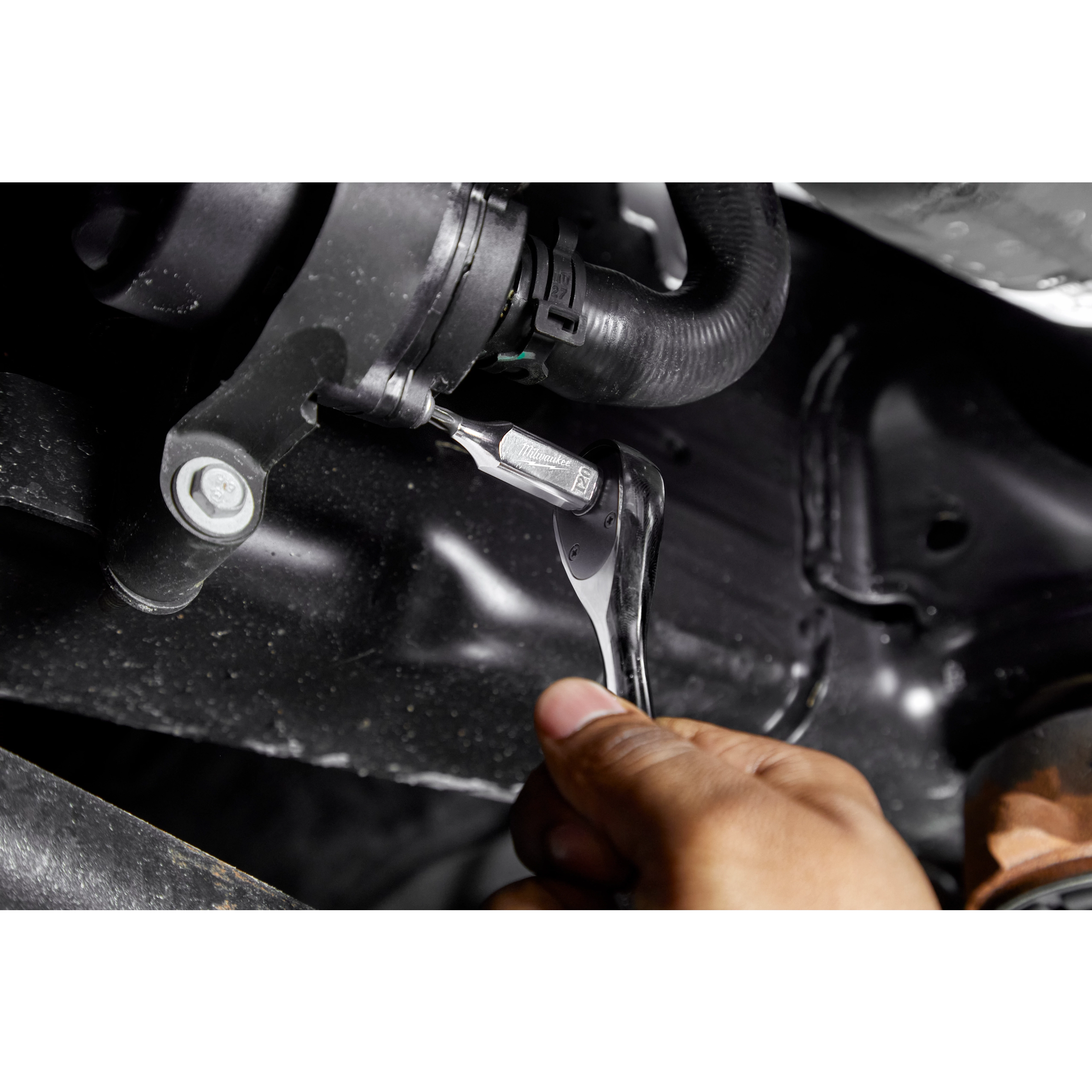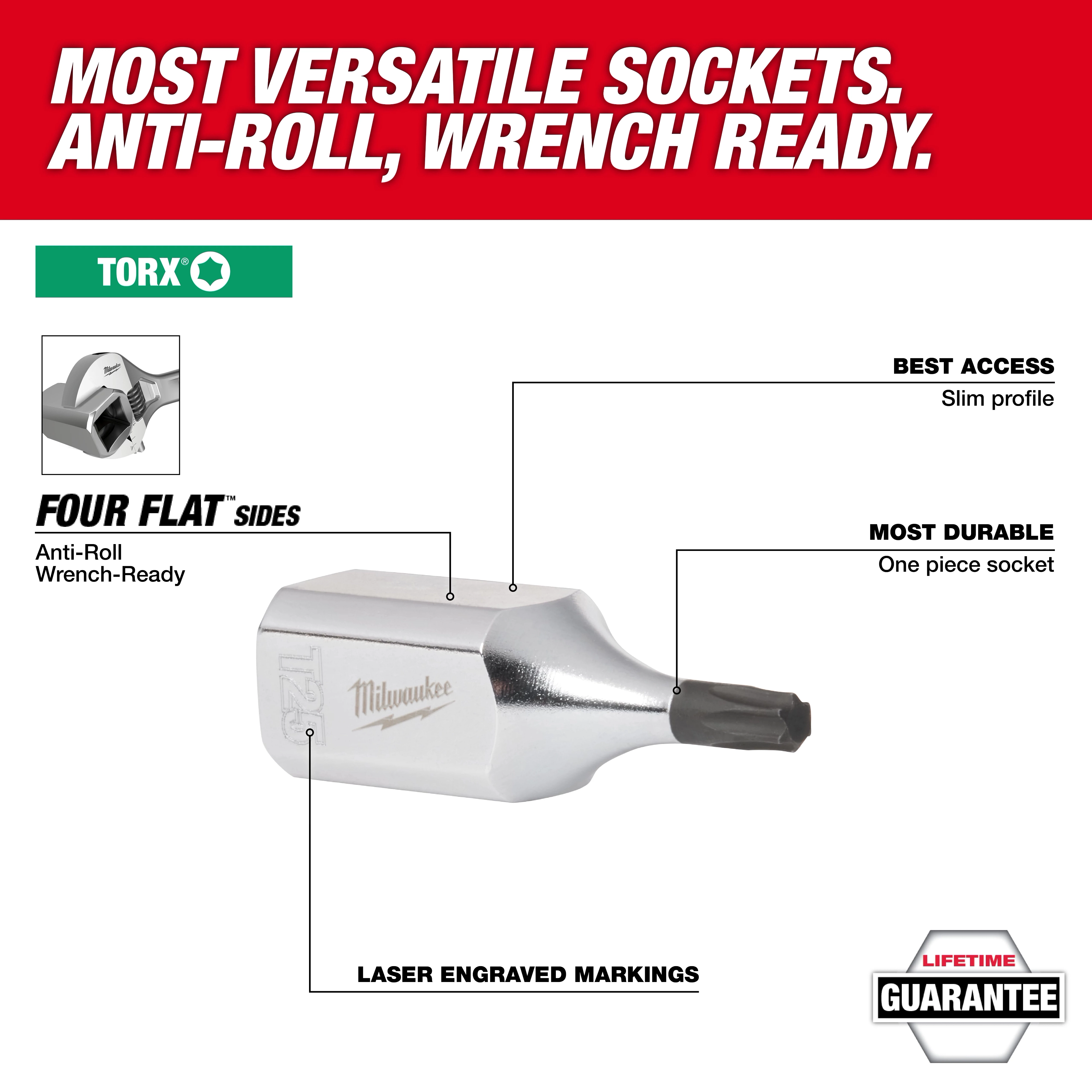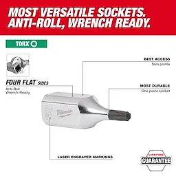 Our TORX® Bit Sockets with FOUR FLAT™ sides are designed from the ground up to be part of the most versatile socket family. Milwaukee® bit sockets feature an innovative design with four parallel flat sides, which deter rolling and are wrench-compatible. This also creates a slim profile to provide the best access in tight spaces. The one-piece socket design offers improved durability compared to two-piece designs by eliminating the risk of the bit separating from the socket base. Laser engraved size markings provide easy identification and chrome plating offers rust and corrosion protection. All Milwaukee® bit sockets are backed by a Lifetime Guarantee.