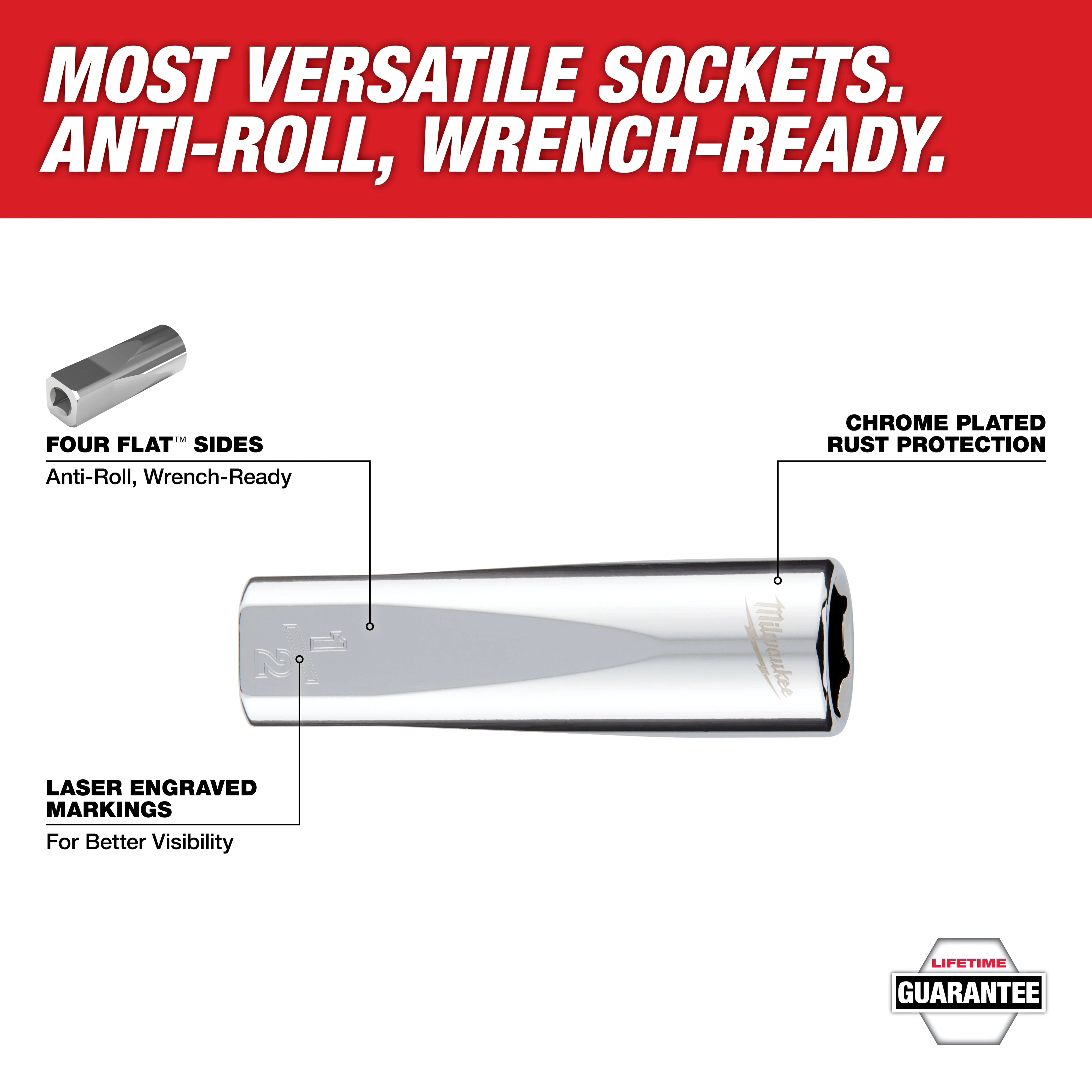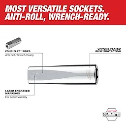 Our 6-Point Socket with FOUR FLAT™ Sides was designed from the ground up to be part of the most versatile socket family. MILWAUKEE® sockets feature an innovative design with four parallel flat sides, which deter rolling and are wrench-compatible. The socket sizes are stamped into the flats providing you with improved, easy-to-read visibility. These deep and standard socket sizes have optimized geometry to reduce bolt rounding and stripping. We back all our sockets with a lifetime guarantee.