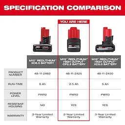 Our M12™ REDLITHIUM™ HIGH OUTPUT™ XC5.0 Battery Pack delivers 25% more power and runs 25% cooler than our other M12™ REDLITHIUM™ XC battery packs. The increase in power elevates the performance of the entire M12™ system and drives the next breakthrough in M12 FUEL™. The lithium-ion battery delivers fade-free power and runs substantially cooler through demanding applications, allowing you to push your cordless power tools throughout a wide range of applications. Each battery pack is built for heavy-duty use, runs cooler, and performs in climates below 0°F/-18°C. In addition, our M12™ REDLITHIUM™ HIGH OUTPUT™ XC5.0 is built with a resistant housing, increasing the protection against exposure to common oils, greases, and solvents found in transportation maintenance and manufacturing environments. Our M12™ REDLITHIUM™ HIGH OUTPUT™ XC5.0 is fully compatible with 125+ M12™ solutions.