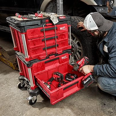 Our PACKOUT™ 2-Drawer Tool Box has a 50lbs weight capacity and a locking security bar that allows you to padlock the drawers closed keeping them securely shut during transport. As part of the PACKOUT™ Modular Storage, the toolbox allows you to customize your storage system for easy transportation and organization of tools and accessories. This portable toolbox with drawers is constructed with impact-resistant polymers, all-metal ball-bearing slides, and metal-reinforced corners for ultimate jobsite durability. The 2-Drawer Tool Box also allows you to customize your drawer layout with Quick-Adjust Dividers (Includes 1 set of dividers). The PACKOUT™ Modular Storage System is the industry's most versatile and durable storage system.