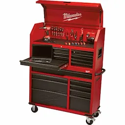 Our 46” Steel Storage Combo is the best equipped tool storage solution in its class. The tool storage cabinet and chest combination provides you with a reinforced angle iron frame, 100lb soft close drawer slides, 1,800 lb weight capacity and 5” industrial casters for superior durability. Our rolling tool box storage combo offers you a variety of innovative features such as our MILWAUKEE® built-in power centers and power tool organizer and an integrated metal peg wall to maximize productivity.