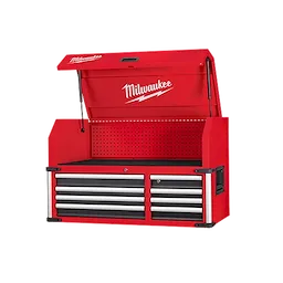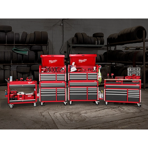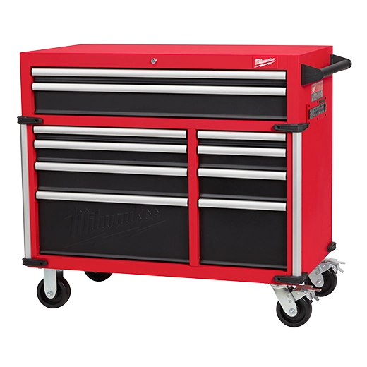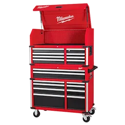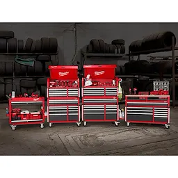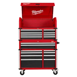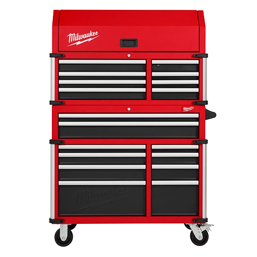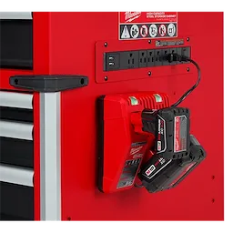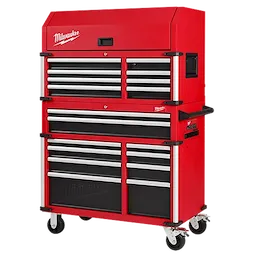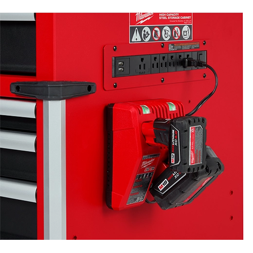 Our 41"" 18-Drawer High-Capacity Industrial Steel Storage Chest and Cabinet are an extra-deep 22-inches, providing a total of 31,705 cubic inches of ample storage space for your toolsets. The power tool storage cabinet is welded with an 18-gauge steel body on top of a 6-gauge angle iron base frame for a 2,500 lb. total load capacity. The drawers feature 120-lb. rated, soft-close, ball-bearing drawer slides, which gently retain from accidental opening or slamming shut. The deep bottom cabinet drawers include double pairs of drawer slides for additional loading capacity and a removable power tool organizer in the bottom right drawer for convenient management of power tools. Easily use and store a laptop or paperwork in the innovative pullout work surface drawer, which can be secured in place with the ball detents. The MILWAUKEE® steel tool chest and cabinet include integrated 6-outlet/2USB power centers for charging battery packs and accessories. Easily maneuver this rolling toolbox around a work area with the 5"" x 2"" industrial casters and knurled push bar handle. The red and black textured finish is rugged, durable, and stands up to harsh environments.