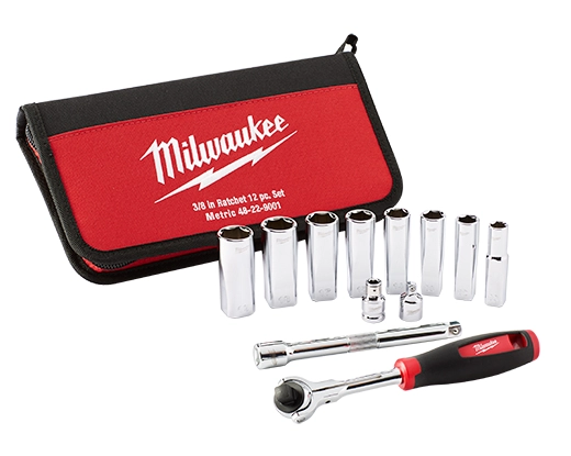 Our 12 piece 3/8” Drive Metric Ratchet Set delivers ultimate versatility and access. The slim-profile ratchet features a pivoting ratchet head, allowing you to use it as a ratchet, a nut driver, or any angle in between. Our FOUR FLAT™ Sides are anti-roll and wrench-ready. Metric socket sizes are stamped into the flats for improved visibility and easy reference. The ratchet wrench kit is stored in a soft-sided carrying case that includes a socket rail to keep sockets and accessories organized, both on and off the job site.