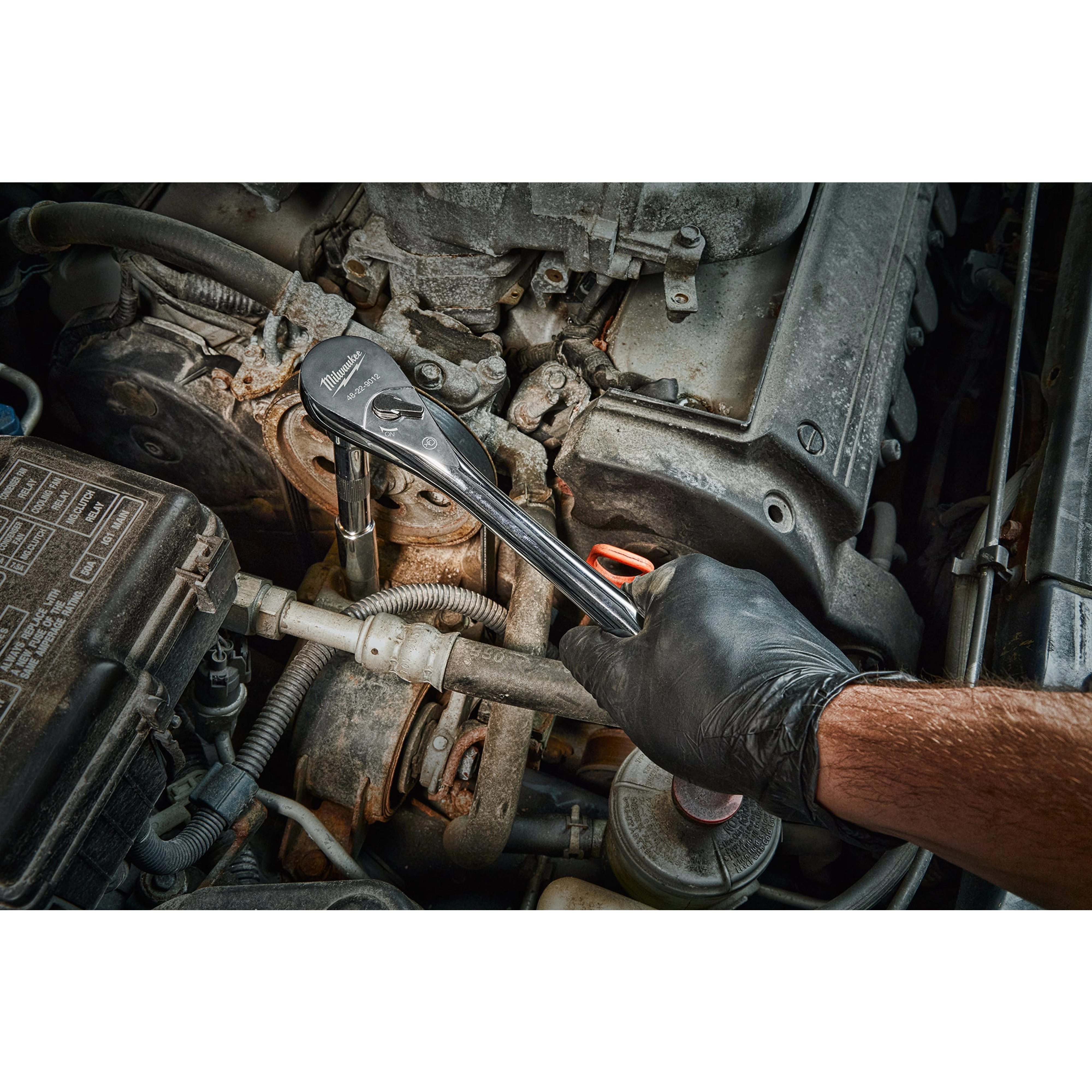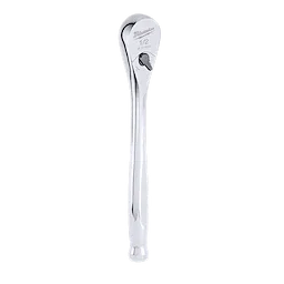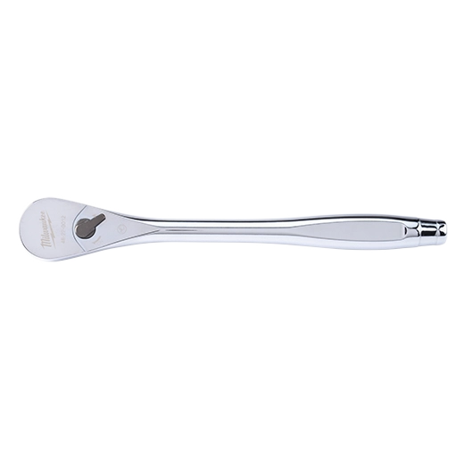 Our ½” Drive Ratchet offers you just 4° of arc swing, allowing access to work in tighter spaces. The MILWAUKEE® drive ratchet features a slim profile design and flush directional lever for better accessibility. The 90-tooth ratchet delivers greater fastener access and an increase in strength during heavy-duty applications thanks to its durable construction. The all-chrome finish provides the ratchet with easy cleaning and a professional look. The ½” ratchet is backed by a lifetime guarantee.