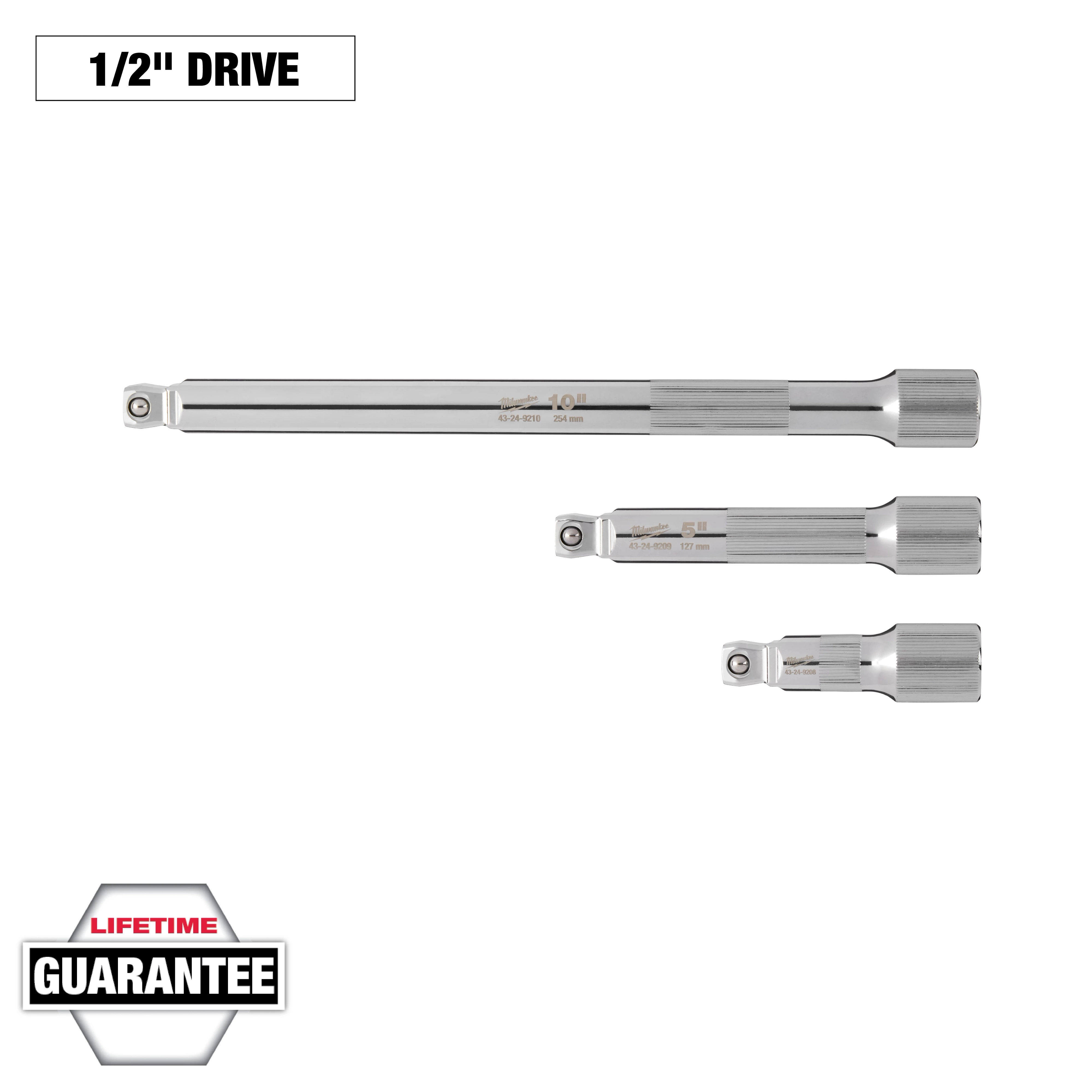 Our 3PC 1/2" Drive Wobble Extension Set offers the most control and better access in even the tightest spaces. The extensions feature the largest knurling surface on both the shaft and female drive end allowing precision control when hand-tightening fasteners or working with oily materials. The set includes a durable compact storage rack designed to optimize drawer space for long-term use. The male square end features a wobble design, providing up to 8 degrees of movement for better access at different angles and in tight spaces. The male end also provides added versatility by doubling as a standard or a wobble extension. The chrome plating on the extensions offers corrosion and rust protection. All Milwaukee® Mechanics Hand Tools are backed by a lifetime guarantee.