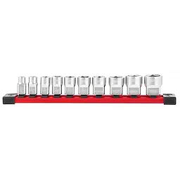 Our SAE 3/8" Drive 10-Piece Socket Set feature 6-point sockets with FOUR FLAT™ sides. This innovative design has four parallel flat sides, which deter rolling and are wrench-compatible. The socket sizes are stamped into the flats, giving you improved visibility. These SAE sockets have optimized geometry to reduce bolt rounding and stripping. The MILWAUKEE® 10 piece socket set is stored on a socket rail for tool organization and is backed with a lifetime guarantee.