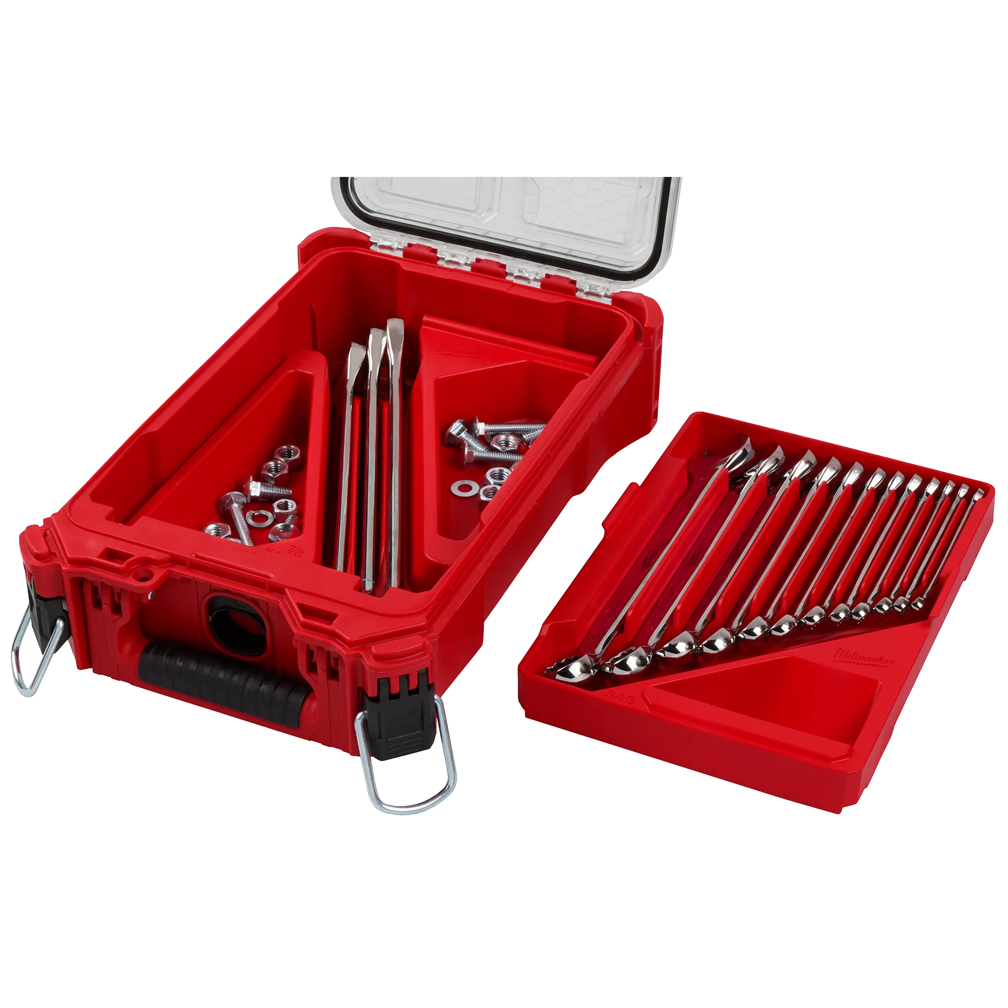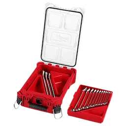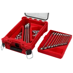 Our 15PC SAE Combination Wrench Set with PACKOUT™ Organizer includes combo wrenches that deliver up to 25% more torque. The MAX BITE™ Open-End Grip improves the wrench's grip on nuts and bolts, and the geometry reduces rounding and stripping. The I-Beam handle design provides comfort in high torque applications and features easy-to-read ink-filled size labeling. All Milwaukee® Mechanics Hand Tools are backed by a Lifetime Guarantee. The included PACKOUT™ Organizer is part of the Most Versatile Durable Modular Storage System. The Organizer is IP65-rated and built from impact-resistant materials for durability on and off the jobsite. All PACKOUT™ is backed by a Limited Lifetime Warranty.