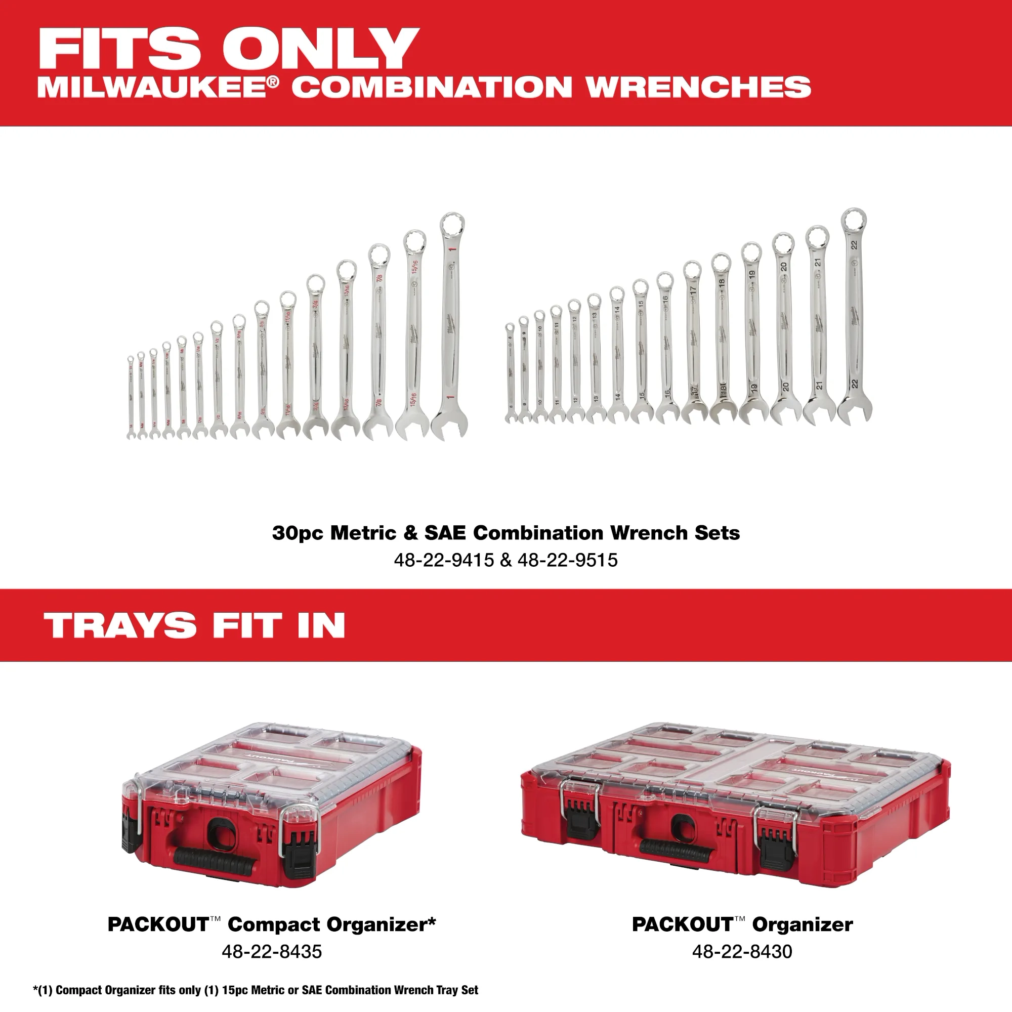 Trays Fits the Following Milwaukee SAE Combination Wrenches: 1/4", 9/32", 5/16", 11/32", 3/8", 7/16", 1/2", 9/16", 5/8", 11/16", 3/4", 13/16", 7/8", 15/16", 1"