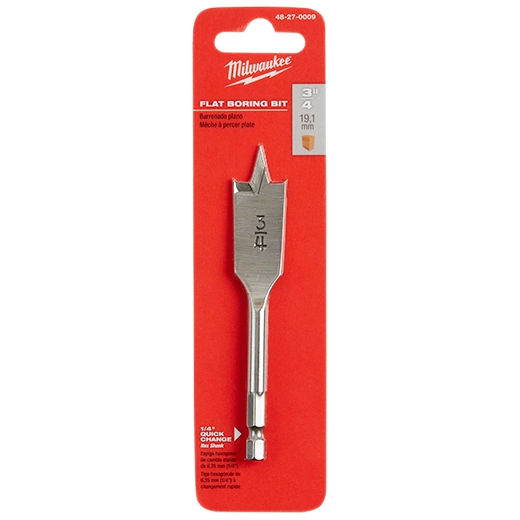 Our MILWAUKEE® Flat Boring Bits are the ideal solution for boring holes at any angle in a variety of materials. Our premium quality spade drill bit is made of heat-treated high carbon steel. We designed the pilot drill point and cutting edge of the paddle bit to able to be resharpened, saving you time while extending the life of the bit. Our 3/4" x 4.5" flat spade bit bores clean, fast holes at any angle in wood, plastic, plywood and Formica.