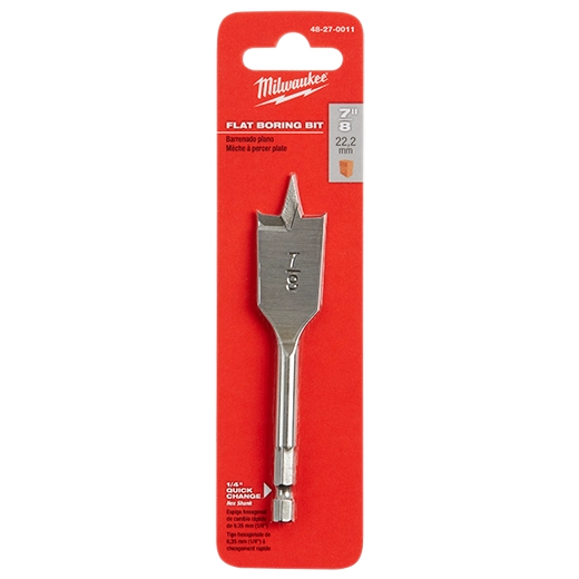 Our MILWAUKEE® Flat Boring Bits are the ideal solution for boring holes at any angle in a variety of materials. Our premium quality spade drill bit is made of heat-treated high carbon steel. We designed the pilot drill point and cutting edge of the paddle bit to able to be resharpened, saving you time while extending the life of the bit. Our 7/8" x 4.5" flat spade bit bores clean, fast holes at any angle in wood, plastic, plywood and Formica.