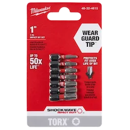 Our SHOCKWAVE™ Impact Duty Torx Driver Bits provide the Ultimate Fit for a superior driving experience. The optimized SHOCKZONE™ shanks are customized per tip type to absorb peak torque and prevent breaking. The long-lasting Wear Guard™ Tip provides increased wear resistance, protecting the fit over the life of the bit. The customized tip geometry leads to less stripping of screws on the job site.