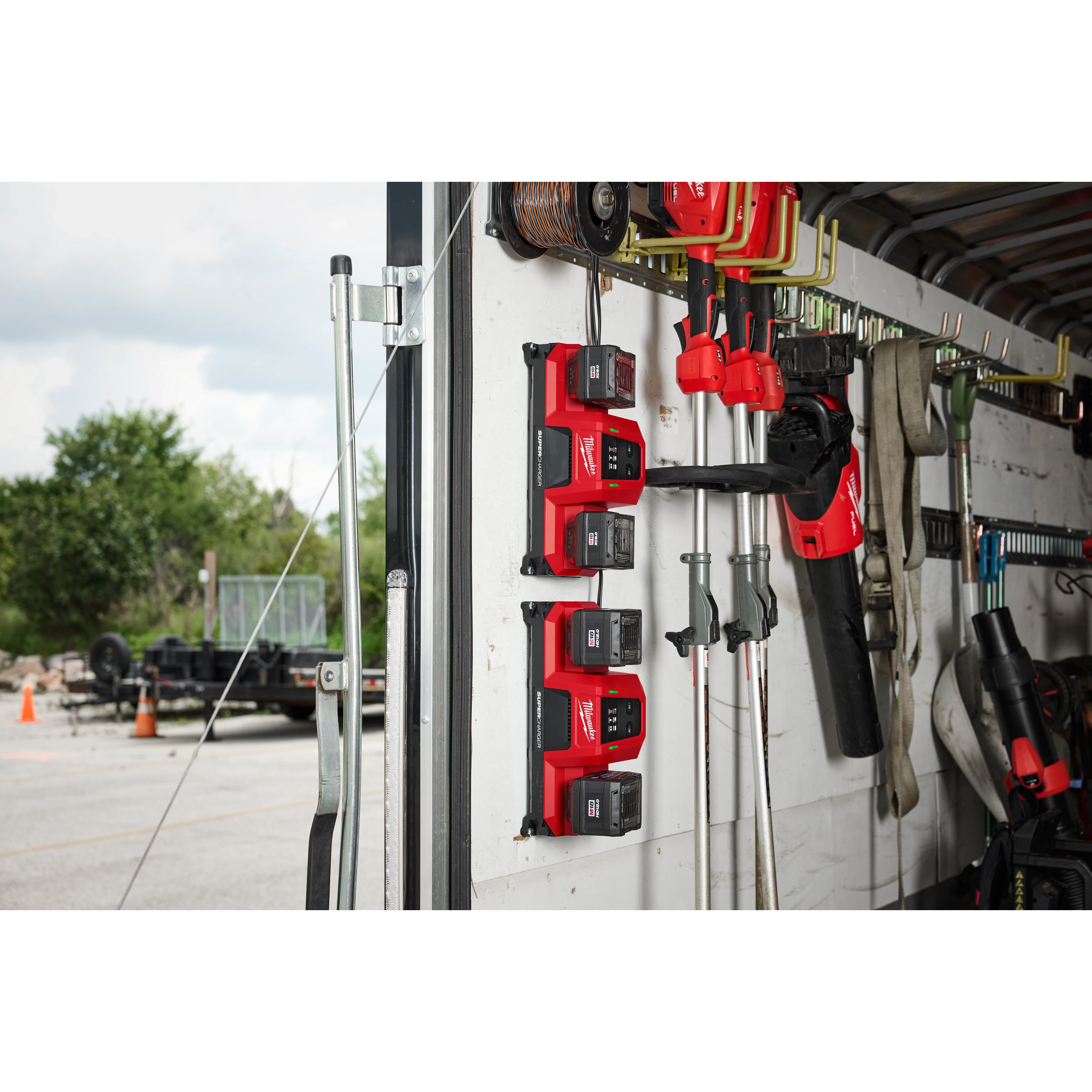 Our M18™ Dual Bay Simultaneous Super Charger with 4 Point Mounting delivers up to 6X faster charging to 80%, maximizing productivity by reducing downtime throughout the day. In just 35 minutes, users can charge an M18™ REDLITHIUM™ FORGE™ XC8.0 or FORGE™ HD12.0 Battery to 80%, allowing users to get back to work faster than ever before. Super Chargers are Milwaukee’s fastest chargers, providing you with the fastest charge times for all of your M18™ REDLITHIUM™ batteries. The M18™ Dual Bay Simultaneous Super Charger is COOL-CYCLE™ Capable. COOL-CYCLE™ Active Cooling System provides high-speed cooling for less downtime. The active cooling feature works with M18™ batteries that have COOL-CYCLE™ capability. This Super Charger is capable of simultaneously charging up to 2 batteries by leveraging CHARGE ADAPT™ Adaptive Charge Distribution to distribute power between bays for maximized productivity. The charger features REDLINK™ Intelligence and communicates directly with your battery to monitor cell voltage, temperature, and charge status to optimize the performance and maximize the life of the pack. Equipped with 4-point mounting, the Super Charger is designed to be mounted anywhere from in the back of a van to an enclosed trailer for charging on the go.