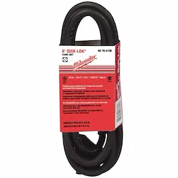 This Milwaukee QUIK-LOK® cord is a three wire grounded 8 foot cord for fast field replacement of a damaged cord. Made of premium grade Hi-Flex wire the cord is quickly removed and attached to Milwaukee tools with the QUIK-LOK® cord feature. To change a damaged cord simply turn the collar at the top of the cord counter clockwise to loosen the nut and pull down on the cord to remove. To re-attach a new cord line up the pins in the end of the tool with the pin receptacles in the end of the cord, push together and turn the collar clockwise to lock in place. Cord has a L5-20P NEMA type plug.
